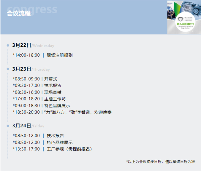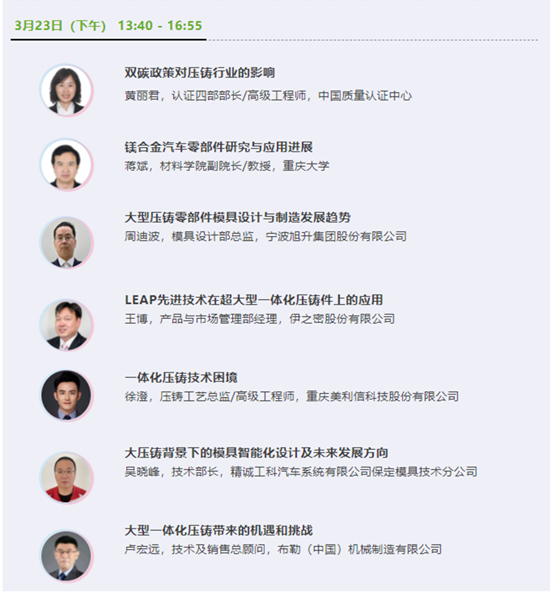 2023全國壓鑄年會將于“3月22—24日”在合肥香格里拉大酒店舉辦,會議以“新能源汽車制造領航大壓鑄時代”為主題,聚焦行業(yè)熱點話題:涉及新材料研發(fā)、汽車主機廠產品及工藝設計、壓鑄上市公司技術及管理經驗分享等;內容覆蓋壓鑄全產業(yè)鏈:囊括設計、材料、模具、裝備、生產及用戶端等;700+參會代表:集結整車廠、壓鑄廠、高校及科研機構以及知名配套商等。誠邀各位壓鑄同仁蒞臨!