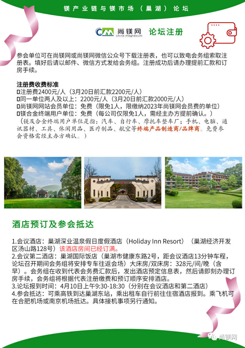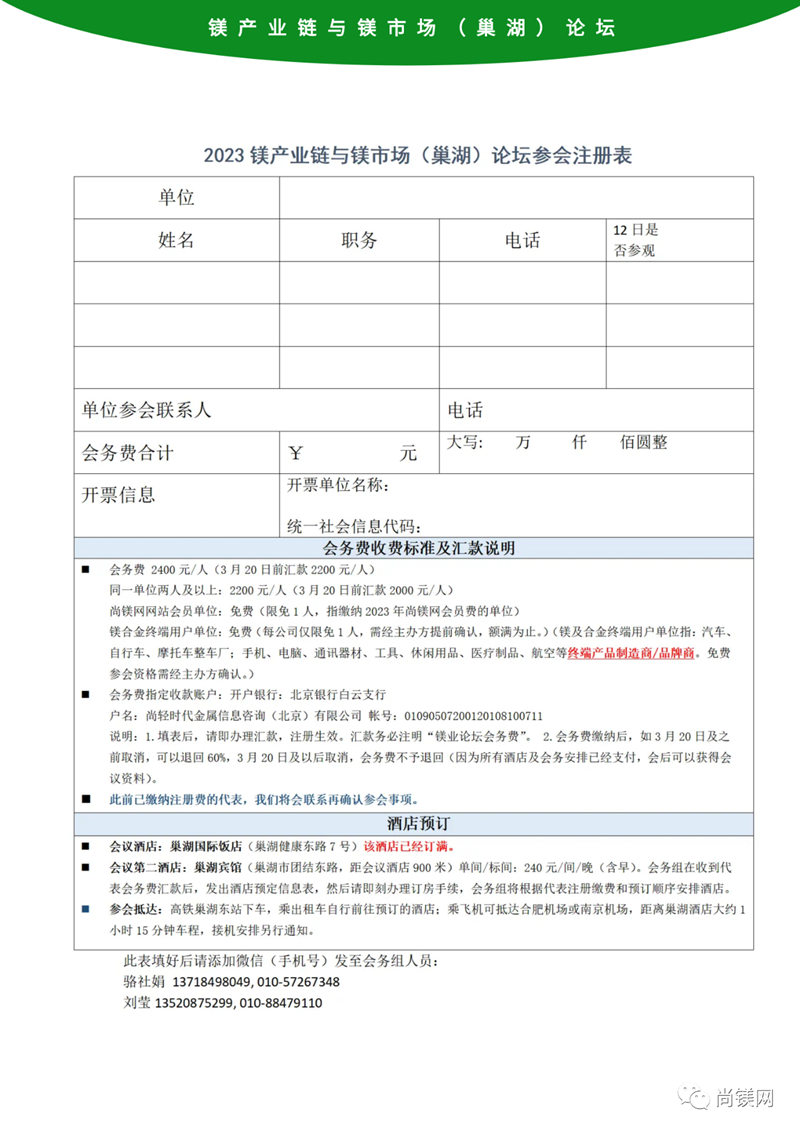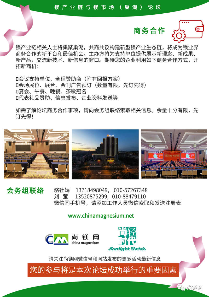 鎂產業鏈相關人士將集聚巢湖,共商共議構建新型鎂產業生態鏈,將成為鎂業界商務合作的新平臺和最佳機會。主辦方將為支持單位提供展示新理念、新成果、新產品,交流新技術、新信息的窗口。期待您的企業利用如下商務合作方式,開拓新商機: 如需了解論壇商務合作事項,請向會務組聯絡索取相關信息。余量十分有限,先訂先得! 截止3月14日,僅余3個會場展位待訂,虛位以待! 會議注冊: