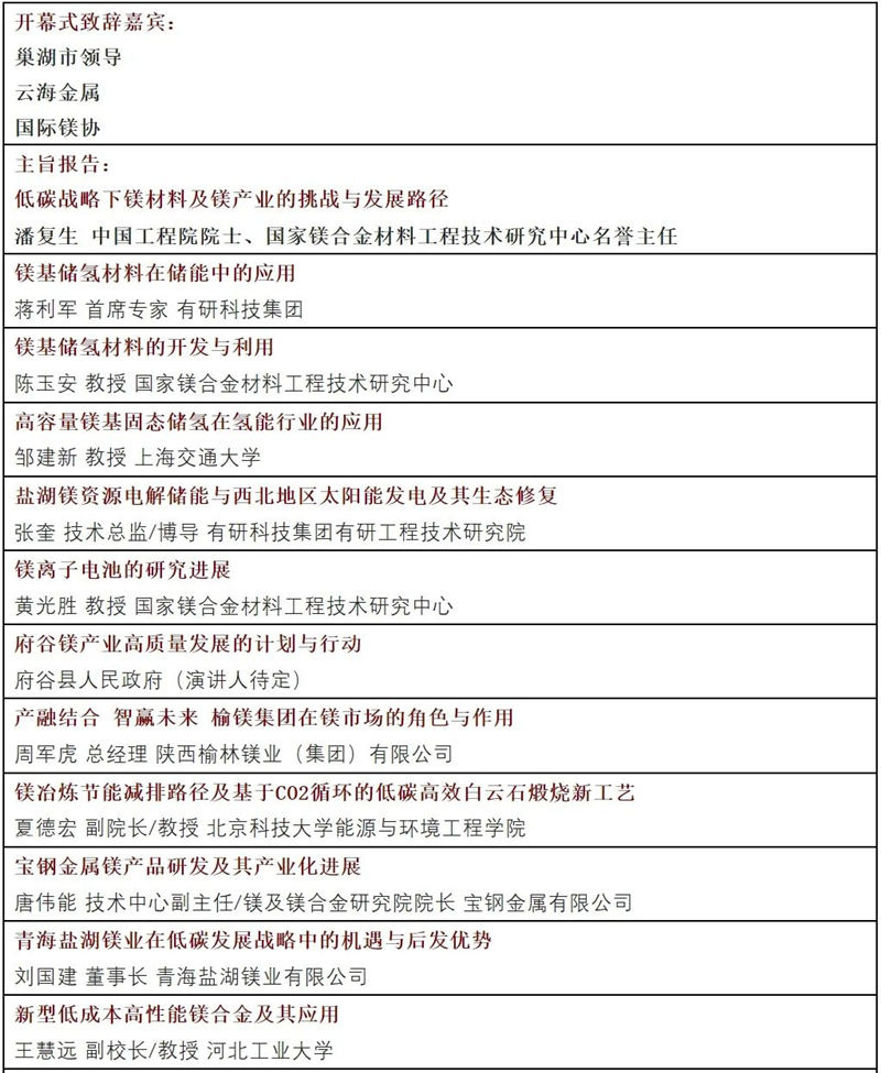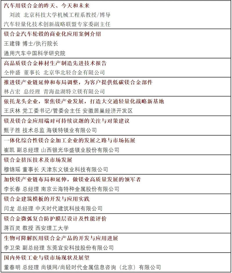 演講嘉賓、題目、順序如有變化,以現場安排為準 參觀活動: 參觀:巢湖云海鎂業、宜安云??萍?、寶鋼金屬寶瑪克科技、居巢經濟開發區 巢湖云海鎂業是云海金屬全資子公司,宜安云??萍际且税部萍寂c云海金屬的合資公司,以這兩家企業為主導,已經在巢湖建成白云石開采-原鎂冶煉(豎式還原爐)-冶煉廢渣綜合利用-廢鎂回收-鎂合金熔煉-鎂合金零部件精深加工完整的鎂產業鏈。是全球單體規模最大最集約化的鎂合金材料和深加工一體化生產基地。本次將安排與會代表參觀該公司先進的原鎂冶煉、鎂合金熔煉、鎂鋁合金壓鑄及機加工、表面處理生產線、公司展廳。 寶瑪克科技是寶鋼金屬的控股子公司,總部位于巢湖。公司聚焦發展鋼、鋁、鎂相結合的系列化輕量化部件產品,力爭成為規模制造并擁有知名品牌的輕量化部件供應商,成為鋼鋁鎂輕量化綜合解決方案的領軍者。公司具備鋼制車身件、鋁制下車身件、鋼鋁側圍等產品的同步設計研發能力,并投入批量生產,主要產品有鋼制輥壓型材、鎂合金擠壓件、鋁合金擠壓件及汽車零部件總裝產品。公司正在巢湖打造有全國影響力的大交通輕量化項目,寶瑪克科技巢湖輕量化項目一期已投產,一期二步已開工建設。 邀請參會人員:
