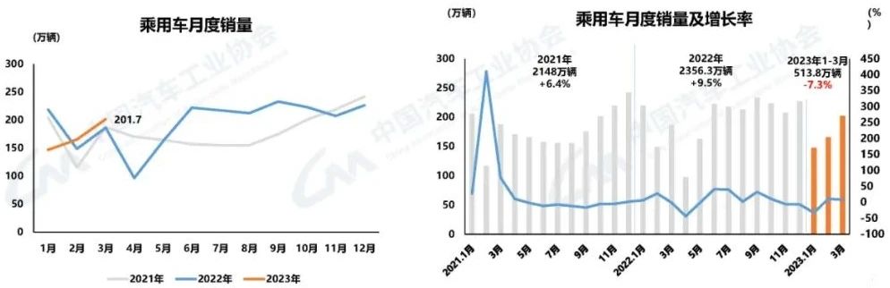 乘用車產(chǎn)銷較快增長 3月,乘用車產(chǎn)銷分別完成214.9萬輛和201.7萬輛,環(huán)比分別增長25.3%和22%,同比分別增長14.3%和8.2%。1-3月,乘用車產(chǎn)銷分別完成526.2萬輛和513.8萬輛,同比分別下降4.3%和7.3%。