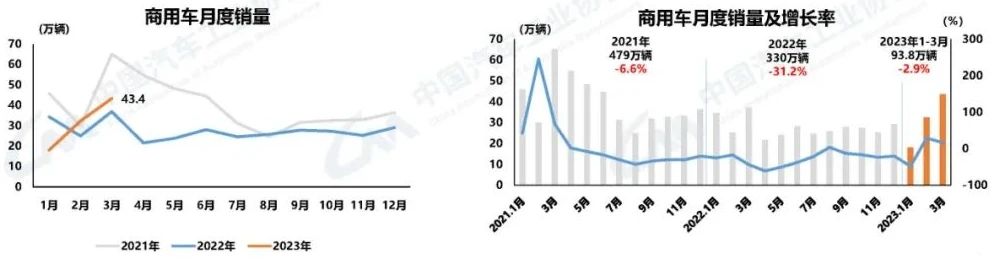 商用車產(chǎn)銷同比環(huán)比雙增長 3月,商用車產(chǎn)銷均完成43.4萬輛,環(huán)比分別增長37.1%和34.2%,同比分別增長20.4%和17.4%。商用車?yán)^續(xù)延續(xù)了2月的產(chǎn)銷同比、環(huán)比雙增長的態(tài)勢。1-3月,商用車產(chǎn)銷分別完成94.8萬輛和93.8萬輛,同比分別下降3.9%和2.9%。
