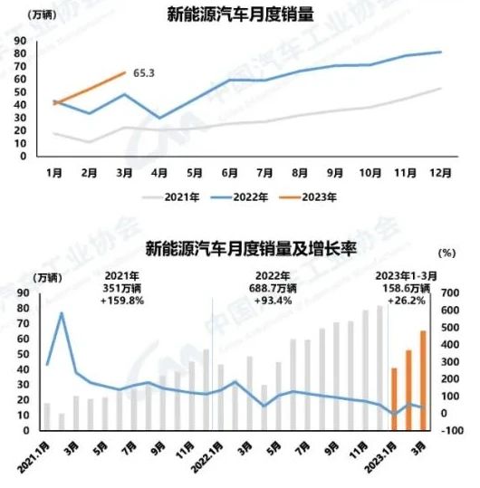 新能源汽車產(chǎn)銷同比持續(xù)增長 3月,新能源汽車產(chǎn)銷分別完成67.4萬輛和65.3萬輛,同比分別增長44.8%和34.8%,市場占有率達(dá)到26.6%。1-3月,新能源汽車產(chǎn)銷分別完成165萬輛和158.6萬輛,同比分別增長27.7%和26.2%,市場占有率達(dá)到26.1%。