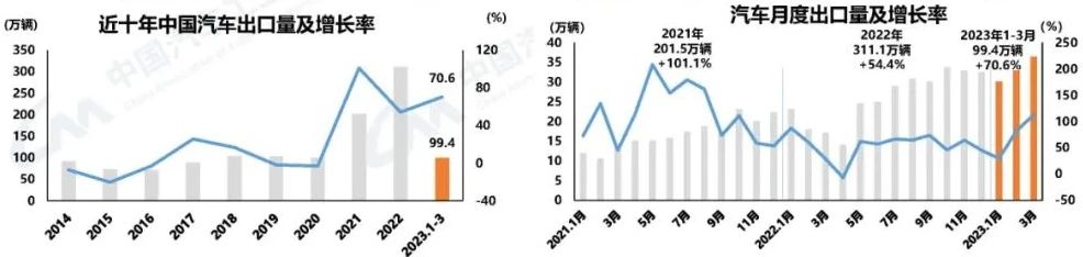 汽車出口持續(xù)迅猛增長 3月,汽車企業(yè)出口36.4萬輛,環(huán)比增長10.6%,同比增長1.1倍。汽車出口延續(xù)了去年強(qiáng)勢出口的態(tài)勢,今年以來增速不斷攀升。1-3月,汽車企業(yè)出口99.4萬輛,同比增長70.6%。