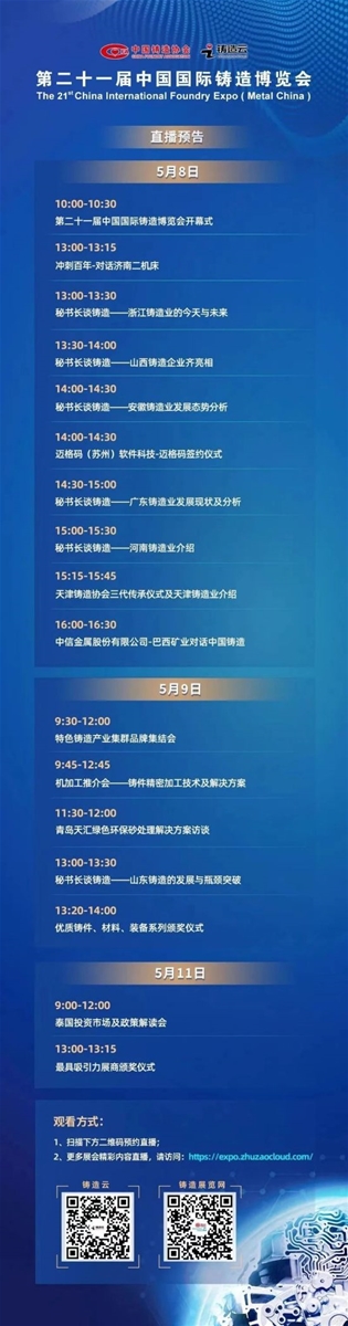 ![]() 2023年5月8-11日,由中國鑄造協(xié)會主辦的“第二十一屆中國國際鑄造博覽會”將在國家會展中心(天津)舉辦。6大主題展館、8萬余平米的展出面積、百余項行業(yè)活動,已有來自30多個國家和地區(qū)的875家知名參展企業(yè)入駐,將吸引10萬人次觀眾現(xiàn)場參與,并有百萬人次專業(yè)觀眾通過線上方式參與觀展交流,展會將再次成為推動鑄造行業(yè)轉型升級、走高質量發(fā)展道路的重要平臺。 本次鑄造博覽會,鑄造云全程提供線上線下技術服務,以下兩種方式可帶您在線參展. 方式一 鑄造云—網(wǎng)上展廳為展商及觀眾提供線上參展、觀展服務,展會期間可在網(wǎng)上展廳觀看展會開幕式、直播專訪活動、優(yōu)質鑄件、材料、裝備系列頒獎儀式以及展會同期活動等。 線上觀展地址:https://expo.zhuzaocloud.com/ 方式二 鑄造云—視頻號將同步直播多項展會活動,關注鑄造云視頻號,預約更多直播預告。