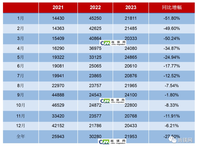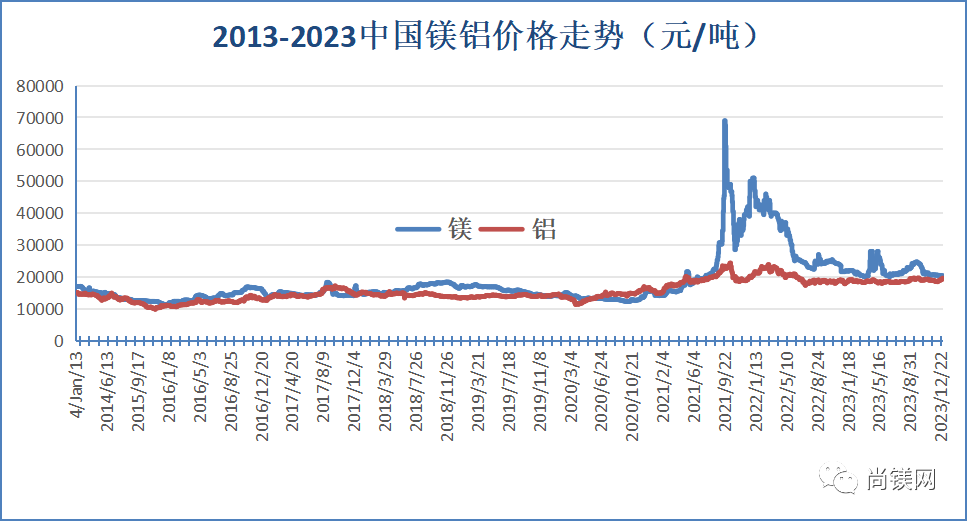 ![]() 尚鎂網發布2023年全年鎂市場價格數據 2023年中國鎂錠價格總體下行并低位區間波動運行,從年初的21600元/噸,下跌至年底20200元/噸,20000元成為重要的支撐線。受府谷地區鎂廠配套蘭炭設施環保改造行動影響,期間在4月中旬和5月中旬9月下旬曾經短暫回彈,從10月中旬開始繼續下行。2023年底的鎂價格已經跌回到2021年7月水平,為32個月來最低值。全年鎂價格月度平均值從1月份的21811元/噸,跌至12月份的20433元/噸。