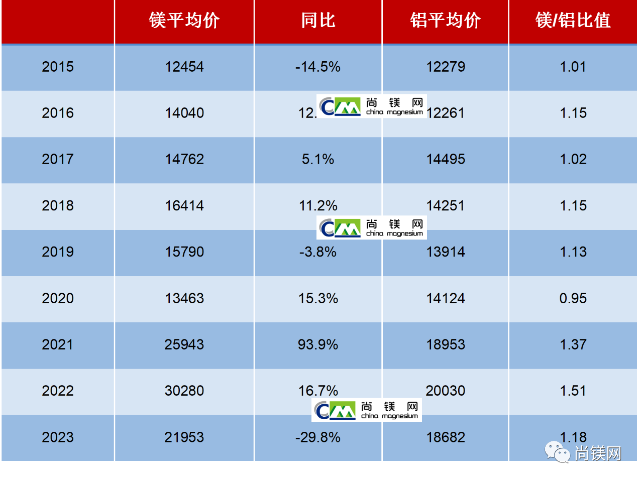 2015-2023年中國鎂錠與鋁錠年度平均價及鋁鎂比值(元/噸)