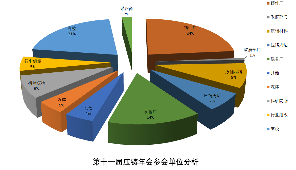 第十一屆(2023年)中國壓鑄、擠壓鑄造、半固態加工年會參會代表500來人,其中,具有高級職稱及以上代表約160人,企業高管約200人。260+家單位參與本次年會(高校50所,鑄件廠81家,設備廠39家,原輔材料及壓鑄周邊40家,行業組織及科研院所35家,媒體及其他26家)。會議安排報告80+。蘇州三基鑄造裝備股份有限公司、含山縣人民政府、三維流動貿易(上海)有限公司、共享智能鑄造產業創新中心有限公司、廣東伊之密精密機械股份有限公司、安徽邁磁雄業科技有限公司、山東宗德機電設備有限公司對贊助了本次年會,33家企業參與了本次年會展示。