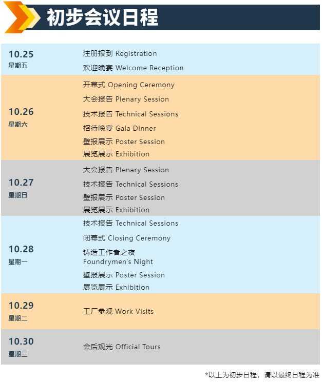 ![]() 世界鑄造會(huì)議(World Foundry Congress,簡稱“WFC”)是全球鑄造行業(yè)最具影響力的國際盛會(huì),每兩年召開一屆,由世界鑄造組織(World Foundry Organization,簡稱“WFO”)主辦,由其成員國申辦,自1923年在法國舉辦以來,為促進(jìn)世界鑄造學(xué)術(shù)、技術(shù)發(fā)展和交流,提高世界各國鑄造技術(shù)水平,推動(dòng)人類文明進(jìn)步,做出了巨大的貢獻(xiàn)。 第75屆世界鑄造會(huì)議將于2024年10月25-30日在四川德陽舉辦。這是中國時(shí)隔14年來第三次舉辦該活動(dòng),預(yù)計(jì)將迎來全球30多個(gè)國家約1500名鑄造行業(yè)知名專家、學(xué)者、企業(yè)界代表參會(huì);均來自海內(nèi)外典型鑄造相關(guān)企業(yè)、科研機(jī)構(gòu)等。 活動(dòng)信息