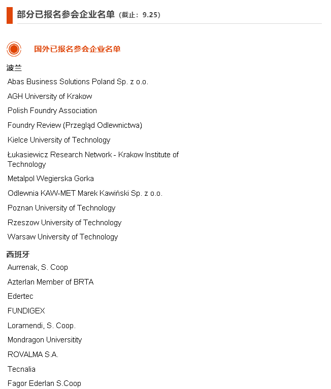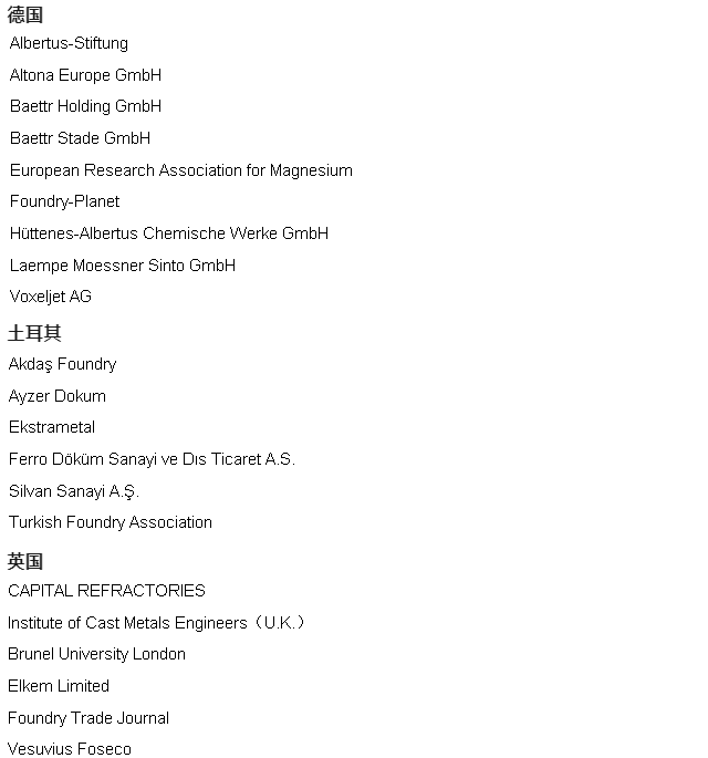 國內(nèi)已報(bào)名參會(huì)企業(yè)名單 埃肯國際貿(mào)易(上海)有限公司 安徽煜銳三維科技有限公司 巴蒂士(嘉興)磨具科技股份有限公司 百鑄網(wǎng) 包頭市鑄造之友工業(yè)材料有限公司 包頭稀土研究院 北京奧宇可鑫表面工程技術(shù)有限公司 北京鋼研高納科技股份有限公司 北京機(jī)科國創(chuàng)輕量化科學(xué)研究院有限公司 北京交通大學(xué) 北京科技大學(xué) 北京仁創(chuàng)砂業(yè)鑄造材料有限公司 北京三帝科技股份有限公司 北京適創(chuàng)科技有限公司 博途新能源(徐州)有限公司 布勒(中國)機(jī)械制造有限公司 常州開源鑄造有限公司 常州中車汽車零部件有限公司 成都科深節(jié)能材料有限公司 成都乾旺鑄造材料有限公司 成都天城精密機(jī)械有限公司 成都鐵城航空機(jī)械有限公司 重慶大學(xué) 重慶卡森科技有限公司 重慶科技大學(xué) 重慶長江造型材料(集團(tuán))股份有限公司 大連交通大學(xué) 大連金泰汽車零部件有限公司 大連理工大學(xué) 大連迅科工業(yè)有限公司 丹東奧龍射線儀器集團(tuán)有限公司 德陽廣大東汽新材料有限公司 德陽天和機(jī)械制造有限責(zé)任公司 德陽天元重工股份有限公司 德陽廣大東汽新材料有限公司 迪砂(常州)機(jī)械有限公司 東北大學(xué) 東方電氣集團(tuán)東方汽輪機(jī)有限公司 東華大學(xué) 東南大學(xué) 東亞科技(蘇州)有限公司 都江堰市萬福金屬構(gòu)件有限公司 《大型鑄鍛件》 鄂爾多斯市富華鑄造材料有限公司 二重(德陽)重型裝備有限公司 佛山大學(xué) 佛山峰合精密噴射成形科技有限公司 佛山市非特新材料有限公司 福建省益強(qiáng)硅砂科技有限公司 繁峙縣憨山通用機(jī)械股份有限公司 FSC跨國鑄造采購平臺(tái) 廣東省鑄力鑄材科技有限公司 廣西蘭科資源再生利用有限公司 國家高速列車技術(shù)創(chuàng)新中心 哈爾濱工業(yè)大學(xué) 哈爾濱吉星機(jī)械工程有限公司 哈爾濱理工大學(xué) 邯鄲悅欣新材料科技有限公司 邯鄲中昂新材料有限公司 杭州磨致機(jī)器人有限公司 河北工業(yè)大學(xué) 河北來福機(jī)械有限公司 河北龍鳳山鑄業(yè)有限公司 河北天琦新材料科技有限公司 河北蔚然建材科技有限公司 河海大學(xué) 河南工業(yè)大學(xué) 河南科技大學(xué) 河南省機(jī)械工程學(xué)會(huì)鑄造分會(huì) 恒屹新材料(山東)有限公司 湖北汽車工業(yè)工業(yè)學(xué)院 湖南嘉順華新材料有限公司 湖南精城特種陶瓷有限公司 華南理工大學(xué) 華南理工大學(xué)國家金屬材料近凈成形工程技術(shù)研究中心 華中科技大學(xué) 華中科技大學(xué)材料成形與模具技術(shù)全國重點(diǎn)實(shí)驗(yàn)室 機(jī)械工業(yè)第六設(shè)計(jì)研究院有限公司 濟(jì)南圣泉集團(tuán)股份有限公司 暨南大學(xué) 江蘇大學(xué) 江蘇恒立液壓股份有限公司常州鑄造分公司 江蘇省機(jī)械工程學(xué)會(huì) 江蘇天宏機(jī)械工業(yè)有限公司 江蘇亞威鑄造材料科技有限公司 江西科技師范大學(xué) 金耐源(河南)工業(yè)科技有限公司 晉城市銳錫鑄造有限公司 晉城市鑫恒瑞鑄造科技有限公司 晉江西峰天然石英砂有限公司 科萊恩化工科技(上海)有限公司 昆明理工大學(xué) 蘭州理工大學(xué) 樂山天華機(jī)械制造有限公司 洛陽赫特儀器設(shè)備有限公司 洛陽凱林鑄材有限公司 洛陽雙瑞精鑄鈦業(yè)有限公司 力勁科技集團(tuán) 邁格碼(蘇州)軟件科技有限公司 美國鋁業(yè)中國研究院 南京航空航天大學(xué) 南京年達(dá)智能裝備科技有限公司 南京中科煜宸激光技術(shù)有限公司 內(nèi)蒙古卓越高新材料有限公司 寧波賽爾斯金屬制品有限公司 寧波通達(dá)精密鑄造有限公司 歐區(qū)愛鑄造材料(中國)有限公司 攀枝花市恒豪鑄造有限公司 普友機(jī)械工業(yè)(遼寧)有限公司 青島九鼎鑄冶材料有限公司 青島汽車進(jìn)出口有限公司 青島泰德機(jī)械有有限公司 青島天啟自動(dòng)化工程有限公司 清華大學(xué) 曲阜冶通鑄材科技發(fā)展有限公司 泉州一核新材料科技有限公司 山東大學(xué) 山東泰力克新材料科技有限公司 山東鑫剛新材料有限公司 山東旭光得瑞高新材料股份有限公司 山西安信鑄造科技股份有限公司 山西富謙特種陶瓷有限公司 山西華翔集團(tuán)股份有限公司 山西龍康機(jī)械制造有限公司 山西清慧勝凱科技股份有限公司 山西三聯(lián)順馳汽車配件有限公司 山西韶澤裝備(集團(tuán))有限公司 山西省機(jī)械工程學(xué)會(huì)鑄造專業(yè)委員會(huì) 山西中兵鑄造有限公司 山西中設(shè)華晉鑄造有限公司 山西中興鑄業(yè)集團(tuán)有限公司 陜西方園冶金設(shè)備有限公司 上海博優(yōu)模具材料有限公司 上海大學(xué) 上海交通大學(xué) 上海凱比拓耐火材料科技有限公司 上海理工大學(xué) 沈陽埃克斯邦科技有限公司 沈陽工業(yè)大學(xué) 沈陽匯亞通鑄造材料有限責(zé)任公司 四川大學(xué) 四川德恩精工科技股份有限公司 四川東樹新材料有限公司 四川法拉特不銹鋼鑄造有限公司 四川工程職業(yè)技術(shù)大學(xué) 四川合一電氣科技有限公司 四川華通偉業(yè)機(jī)械設(shè)備制造有限公司 四川省高品易鑄造材料有限公司 四川省鑄造協(xié)會(huì) 四川眾安耀德精密機(jī)械有限