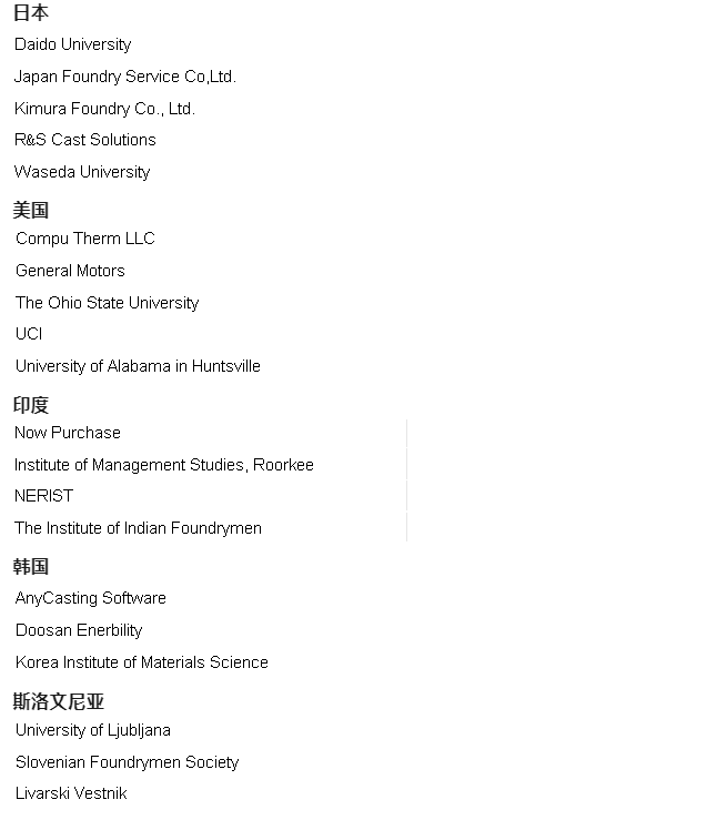 聯(lián)合承辦: 協(xié)辦單位: 全國鑄造標(biāo)準(zhǔn)化技術(shù)委員會(huì) 清華大學(xué) 上海交通大學(xué) 華中科技大學(xué) 四川大學(xué) 哈爾濱工業(yè)大學(xué) 東南大學(xué) 山東大學(xué) 西北工業(yè)大學(xué) 華南理工大學(xué) 吉林大學(xué) 大連理工大學(xué) 重慶大學(xué) 北京科技大學(xué) 南京理工大學(xué) 東北大學(xué) 北京交通大學(xué) 鄭州大學(xué) 上海大學(xué) 暨南大學(xué) 武漢理工大學(xué) 中國礦業(yè)大學(xué) 河海大學(xué) 中國地質(zhì)大學(xué) 東華大學(xué) 合肥工業(yè)大學(xué) 上海理工大學(xué) 河北工業(yè)大學(xué) 齊魯工業(yè)大學(xué) 南昌航空大學(xué) 河南科技大學(xué) 中北大學(xué) 沈陽工業(yè)大學(xué) 蘭州理工大學(xué) 煙臺(tái)大學(xué)核裝備與核工程學(xué)院 哈爾濱理工大學(xué) 東莞理工學(xué)院 太原科技大學(xué) 閩江學(xué)院 湖北汽車工業(yè)學(xué)院 太原理工大學(xué) 西安交通大學(xué) 西安理工大學(xué) 四川工程職業(yè)技術(shù)大學(xué) 中國科學(xué)院金屬研究所 中國兵器工業(yè)第五九研究所 北京航空材料研究院 中國科學(xué)院寧波材料技術(shù)與工程研究所 包頭稀土研究院 德陽廣大東汽新材料有限公司 二重(德陽)重型裝備有限公司 一汽鑄造有限公司 四川德恩精工科技股份有限公司 清潔高效透平動(dòng)力裝備全國重點(diǎn)實(shí)驗(yàn)室 江蘇省機(jī)械工程學(xué)會(huì)鑄造專業(yè)委員會(huì) 江蘇省鑄造協(xié)會(huì) 浙江省機(jī)械工程學(xué)會(huì)鑄造分會(huì) 浙江省鑄造行業(yè)協(xié)會(huì) 山西省機(jī)械工程學(xué)會(huì)鑄造專業(yè)委員會(huì) 山西省鑄造行業(yè)協(xié)會(huì) 四川省鑄造協(xié)會(huì) 四川省機(jī)械工程學(xué)會(huì)鑄造分會(huì) 河南省機(jī)械工程學(xué)會(huì)鑄造分會(huì) 河南省鑄鍛工業(yè)協(xié)會(huì) 山東省鑄造協(xié)會(huì) 遼寧省機(jī)械工程學(xué)會(huì)鑄造分會(huì) 遼寧省鑄鍛行業(yè)協(xié)會(huì) 福建省機(jī)械工程學(xué)會(huì)鑄造專業(yè)委員會(huì) 福建省鑄造行業(yè)協(xié)會(huì) 香港鑄造業(yè)總會(huì) 湖北省機(jī)械工程學(xué)會(huì)鑄造專業(yè)委員會(huì) 湖北省鑄造協(xié)會(huì) 廣西機(jī)械工程學(xué)會(huì)鑄造分會(huì) 廣西鑄造協(xié)會(huì) 廣東省機(jī)械工程學(xué)會(huì)鑄造分會(huì) 廣東省鑄造行業(yè)協(xié)會(huì) 內(nèi)蒙古機(jī)電工程學(xué)會(huì)鑄造專業(yè)委員會(huì) 安徽省機(jī)械工程學(xué)會(huì)鑄造專委會(huì) 貴州省機(jī)械工程學(xué)會(huì)鑄造分會(huì) 云南省機(jī)械工程學(xué)會(huì)鑄造分會(huì) 甘肅省機(jī)械工程學(xué)會(huì)鑄造專業(yè)委員會(huì) 新疆機(jī)械工程學(xué)會(huì)鑄造專業(yè)委員會(huì) 吉林省鑄造協(xié)會(huì) 重慶市機(jī)械工程學(xué)會(huì)鑄造分會(huì) 重慶市鑄造協(xié)會(huì) 西安市鑄造學(xué)會(huì) 中車戚墅堰機(jī)車車輛工藝研究所股份有限公司 機(jī)械工業(yè)第六設(shè)計(jì)研究院有限公司 濟(jì)南圣泉集團(tuán)股份有限公司 維蘇威鑄造科技(江蘇)有限公司 維捷(蘇州)三維打印有限公司 邁格碼(蘇州)軟件科技有限公司 廣西蘭科資源再生利用有限公司