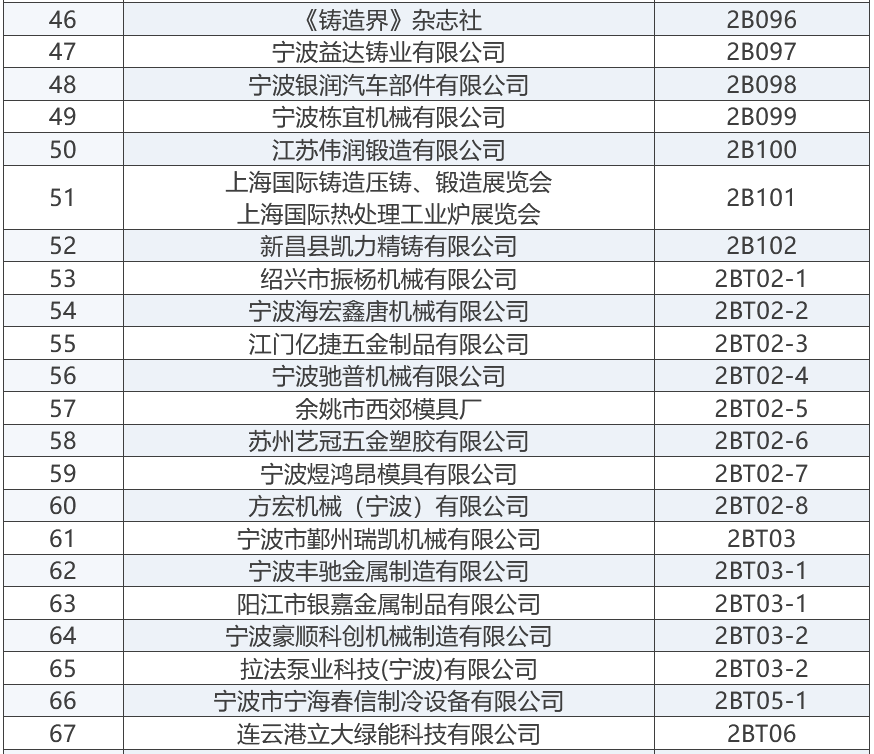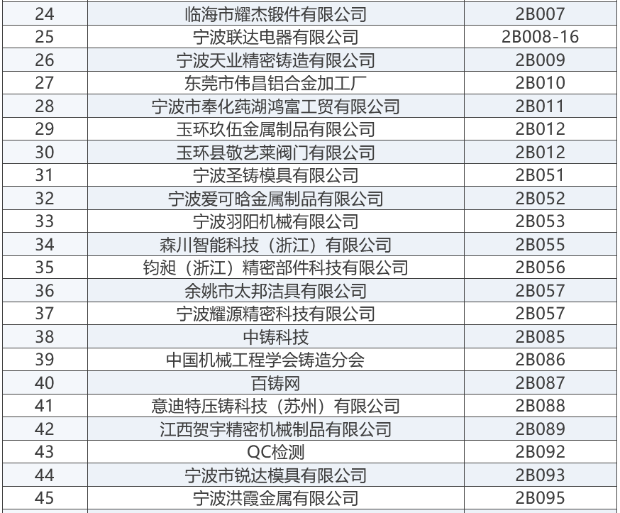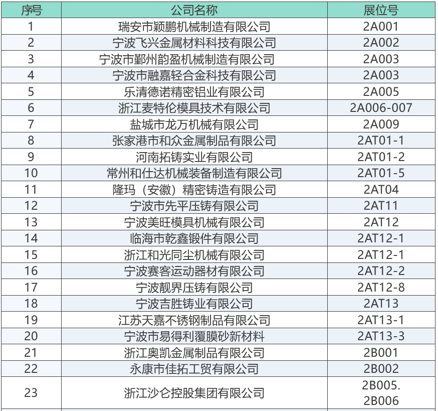 上屆展會部分參展商 “2025寧波國際鑄造鍛造及壓鑄工業展覽會”將成為浙江地區鑄造與壓鑄行業的一大盛事,為鑄造、鍛造及壓鑄行業的交流與合作搭建起一座重要的橋梁。與此同時,寧波國際金屬冶金工業展覽會,將與“2025寧波國際鑄造及壓鑄展”同期舉辦,可形成資源共享、相得益彰之勢。 展商名錄