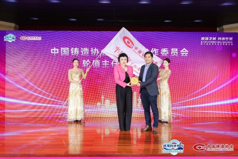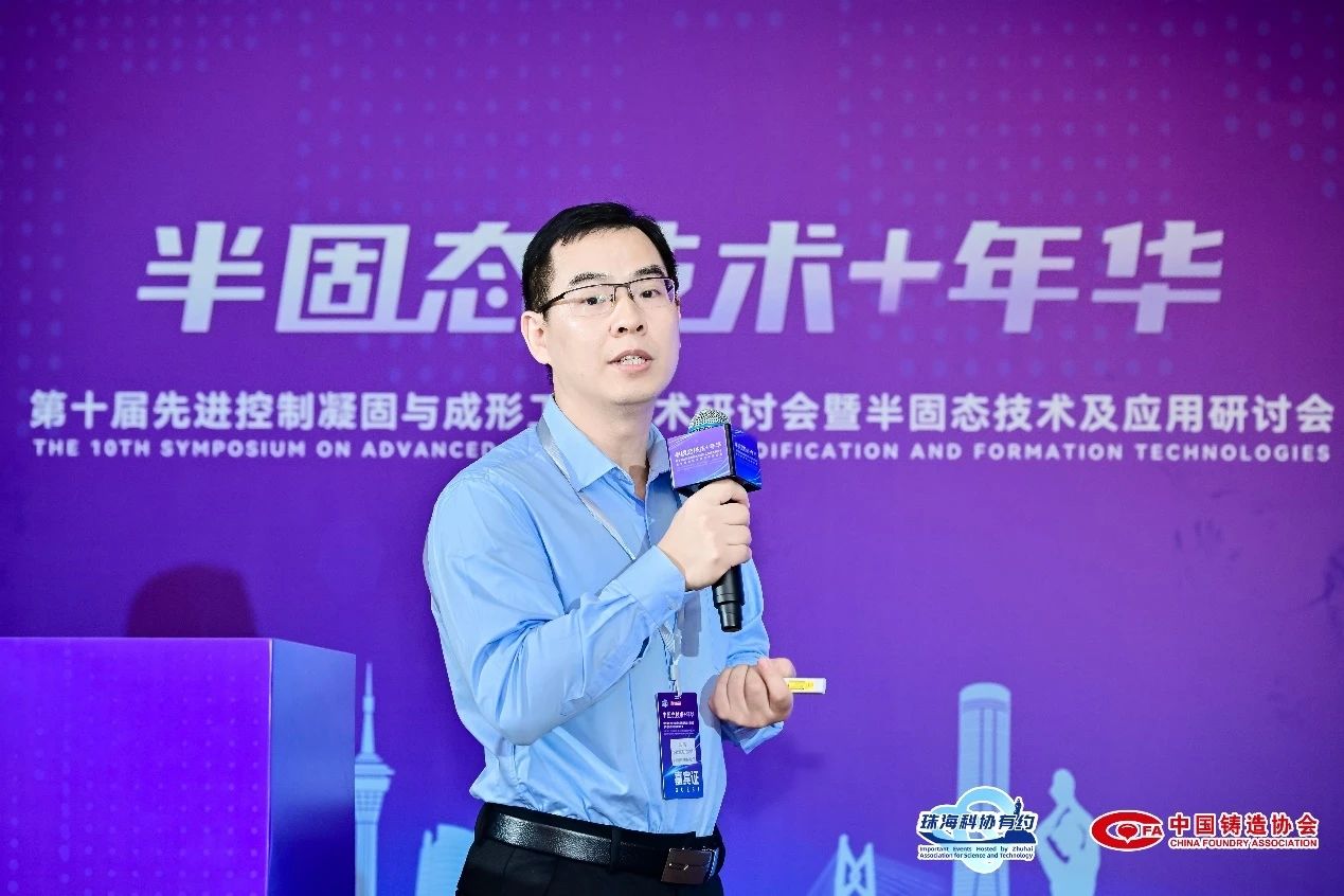國家級特聘專家、南方科技大學講席教授朱強以《半固態最新研究成果及發展趨勢》為題作報告 在本屆大會晚宴上,還進行了半固態工作委員會輪值主任交接儀式,中國鑄造協會半固態委員會本屆輪值主任張瑩女士為下屆輪值主任周俊先生授旗,頒發聘任書,任命周俊先生為中國鑄造協會半固態委員會新一屆輪值主任。