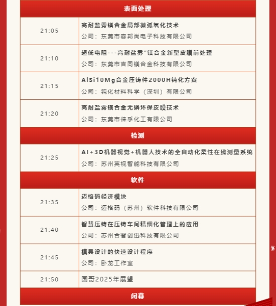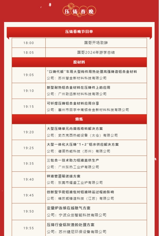 ![]() “壓鑄春晚”是由中鑄科技打造的專注于壓鑄行業(yè)年度技術創(chuàng)新發(fā)布的線上盛會。通過線上直播形式,將壓鑄行業(yè)本年度的新技術、新產品展示給30萬壓鑄行業(yè)從業(yè)者,實現(xiàn)足不出戶,即可掌握行業(yè)最新動態(tài),洞察全年行業(yè)趨勢。 中鑄科技繼在2020年首次舉辦后,已連續(xù)舉辦了四屆「壓鑄春晚」,每屆春晚都取得了圓滿成功。 四屆直播觀眾人數(shù)分別為33392,75701,76911、52027人。從最初試水的3萬多人,到后來疫情下直播的高峰,到2023年的趨于平穩(wěn)。四屆春晚累計分享了122個壓鑄行業(yè)新技術/新產品。 關于壓鑄春晚 主題:2024年度壓鑄行業(yè)新產品新技術盤點 活動時間:2024年12月30日18:00-22:00