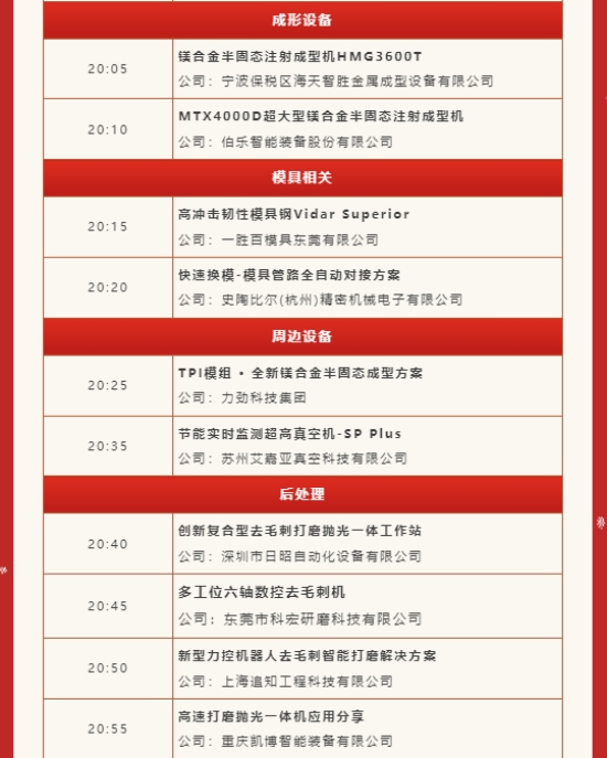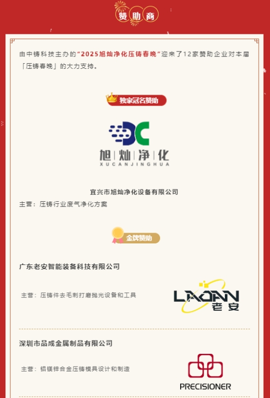 活動方式 :微信視頻直播(點擊即刻預約) 中鑄科技 獨家冠名: 宜興市旭燦凈化設備有限公司 金牌贊助: 廣東老安智能裝備科技有限公司 深圳市品成金屬制品有限公司 蘇州艾嘉亞真空科技有限公司 寧波新昱智能科技有限公司 浙江金佳潤新材料有限公司 東莞市吉同鎂合金科技有限公司 創(chuàng)斯特精密機械(昆山)有限公司 中能智能機器人有限公司 安徽萬克姆自動化科技有限公司 東莞市容邦尚電子科技有限公司 寧波匠心快速成型技術有限公司