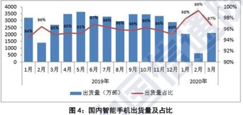 3月,智能手機(jī)出貨量2102.9萬(wàn)部,同比下降21.9%,占同期手機(jī)出貨量的96.7%;1-3月,智能手機(jī)出貨量4773.6萬(wàn)部,其中Android手機(jī)在智能手機(jī)中占比88.8%。
