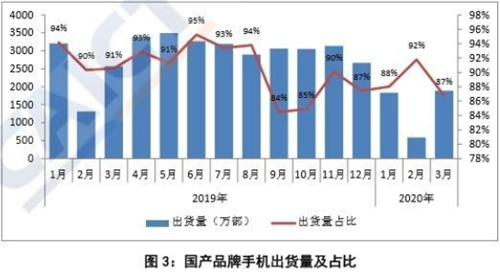 在國(guó)內(nèi)手機(jī)市場(chǎng)國(guó)內(nèi)外品牌構(gòu)成方面,2020年3月,國(guó)產(chǎn)品牌手機(jī)出貨量1887.5萬(wàn)部,同比下降26.5%,占同期手機(jī)出貨量的86.8%。1-3月,國(guó)產(chǎn)品牌手機(jī)出貨量4305.2萬(wàn)部,同比下降39.2%,占同期手機(jī)出貨量的87.9%。 |