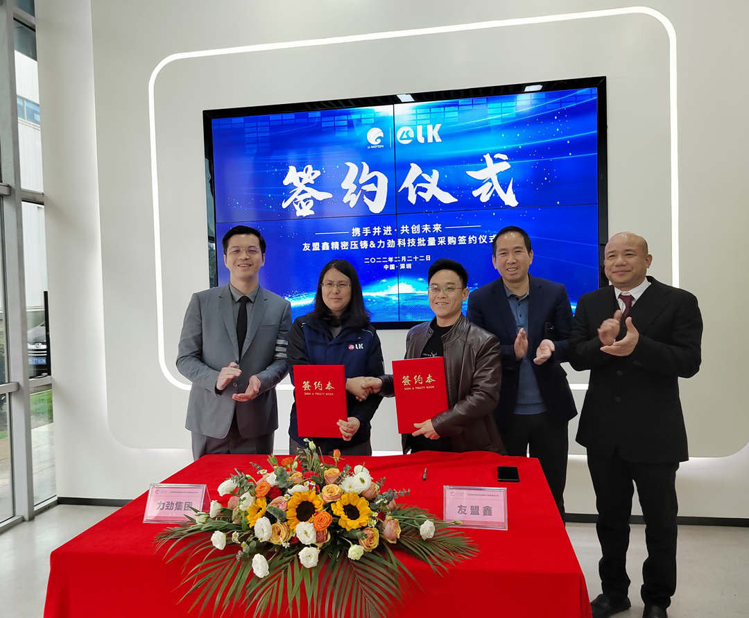 ![]() 2022年2月22日上午,國內知名LED鎂鋁壓鑄箱體制造商——東莞友盟鑫精密壓鑄科技有限公司(“友盟鑫”)與力勁集團批量壓鑄設備采購簽約儀式,在力勁(深圳)高新技術工業(yè)園舉行。據悉,友盟鑫將引進12套力勁品牌智能壓鑄單元,投放于其位于重慶銅梁新項目。