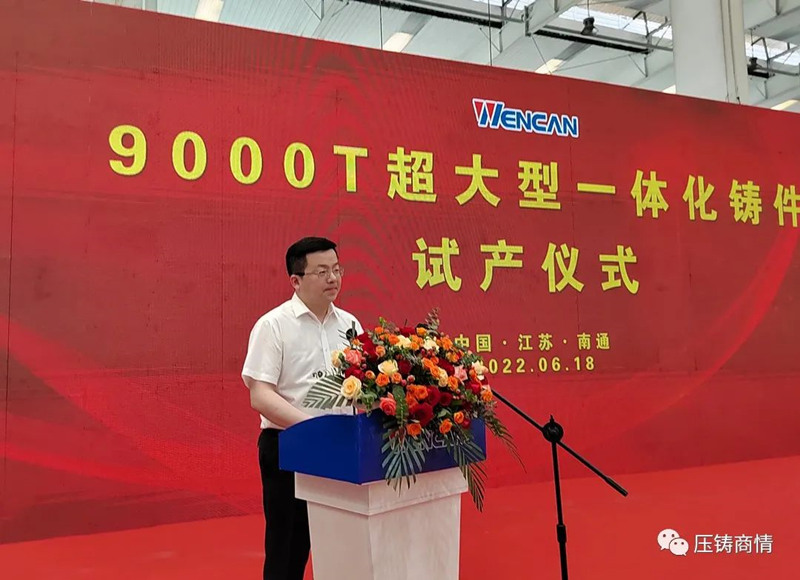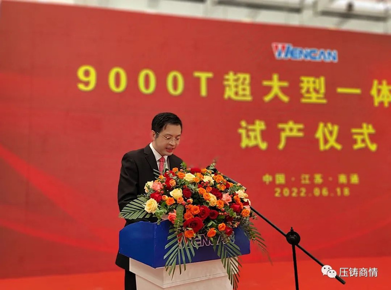 文燦集團董事長兼總經理唐杰雄先生致辭 唐杰雄先生在致辭中感謝各位來賓克服疫情的干擾,來到文燦集團南通基地,參加江蘇雄邦 9000T 超大型一體化鑄件試產儀式。他表示,此次南通基地試產的后地板項目,是從 6000 噸跨躍到 9000 噸,是整體式后地板的超大型一體化壓鑄的重要里程碑,也是文燦集團率先采用 9000T 試制后地板項目的突破性舉措,更好地保證了產品的質量。為客戶解決繁瑣的裝配過程,實現更高精度更高性能的大型一體化壓鑄開啟了壓鑄界的新篇章。 據介紹,文燦南通生產基地目前已量產的壓鑄機共有 48 臺,其中大噸位壓鑄機已有 20 臺,6000 噸 2 臺,9000 噸 1 臺。到今年年底會再布局安裝 2800、3500、 4500 及 7000T 的 8 臺大型壓鑄機,以滿足日益新增的訂單需求。南通生產基地從 2012 年投入車身結構件的研發,一路走來歷經設備選型定位、工藝突破、材料壁壘突破、模具創新等,挑戰了很多的不可能;2021 年,又進一步探索超大型一體化鑄件的研發,先發布局、再次挑戰與攀頂壓鑄極限。