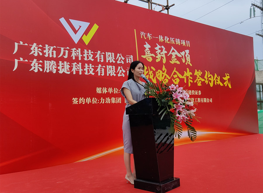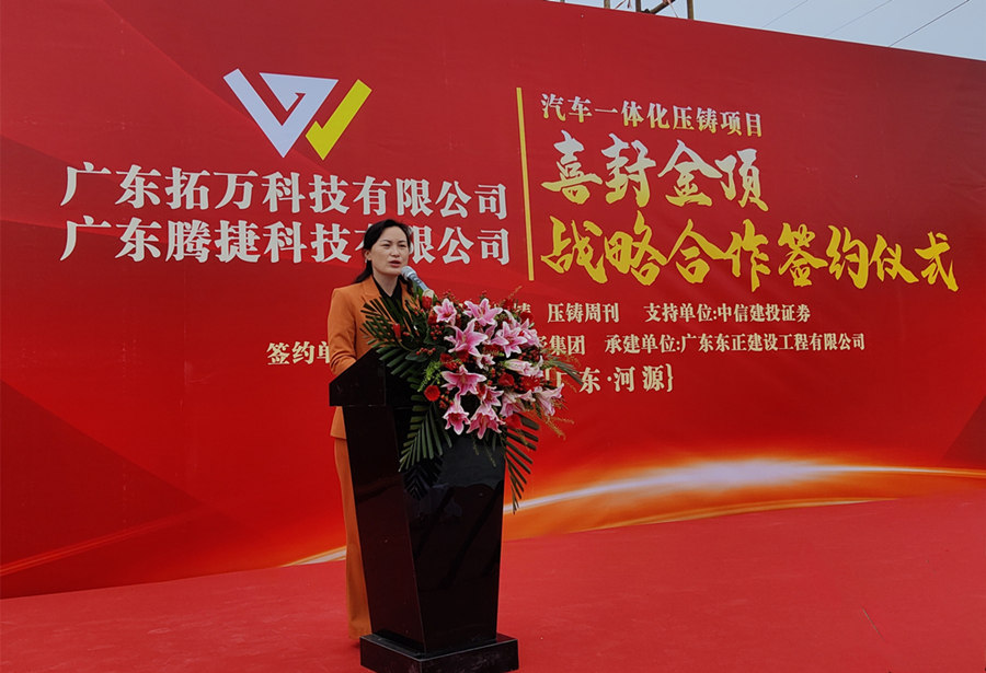廣東拓萬董事長鄒春霞女士 致辭 廣東拓萬董事長鄒春霞女士在致辭中對東源縣委縣政府、項目施工方、客戶及供應商為項目順利推進給予的支持和幫助表示衷心感謝。她表示,拓萬汽配項目自2020年簽約落戶,2021年6月開始施工,在短短一年多時間里就完成五棟廠房主體建設,這是拓萬公司發(fā)展史上的一個新的里程碑。按計劃項目將于明年初正式投產(chǎn)。在此基礎上,拓萬公司也將于2023年進行股改,2026年申請在A股上市。 鄒春霞女士介紹,廣東拓萬汽配項目由東莞市拓萬實業(yè)有限公司全資控股,位于廣東省河源市東源縣鹽東物流園,占地面積為40畝,新建廠房等建筑合計建筑面積5萬平米。項目共投資3億,其中廠房建設1億、設備投資2億。項目建成后,公司將加大在新能源領域的投入,提高新能源汽車結構件的產(chǎn)能,助力公司在新能源領域中取得領先地位,進而提升公司的市場競爭力。 據(jù)介紹,拓萬公司在大型(一體化)壓鑄設備的選擇上,將綜合考慮壓鑄件產(chǎn)品的工藝需求和不同品牌設備的性能優(yōu)勢,河源汽配項目一期規(guī)劃11臺壓鑄機,噸位型號為800T-2500T,200臺CNC加工設備;二期規(guī)劃5臺2500-4500T壓鑄機,200臺CNC加工設備。