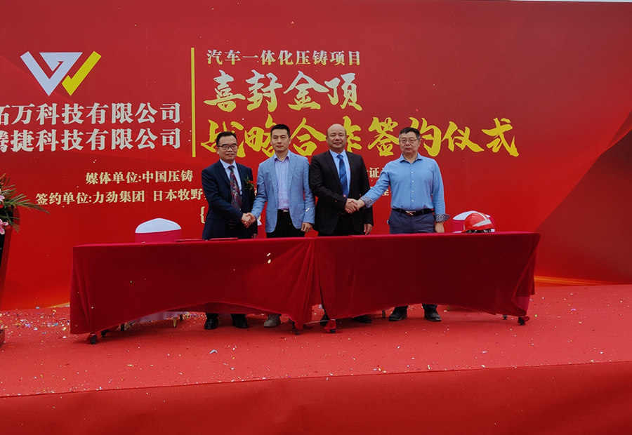 緊接著,主辦方舉行了廣東拓萬科技有限公司與力勁集團,廣東騰捷科技有限公司與日本牧野機床戰(zhàn)略合作簽約儀式,簽約方代表分別在采購協(xié)議上簽字。其中,在廣東拓萬與力勁集團戰(zhàn)略合作協(xié)議部分,廣東拓萬將引進首批11臺大型冷室壓鑄機,投放于拓萬(河源)汽配項目。