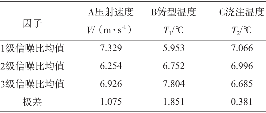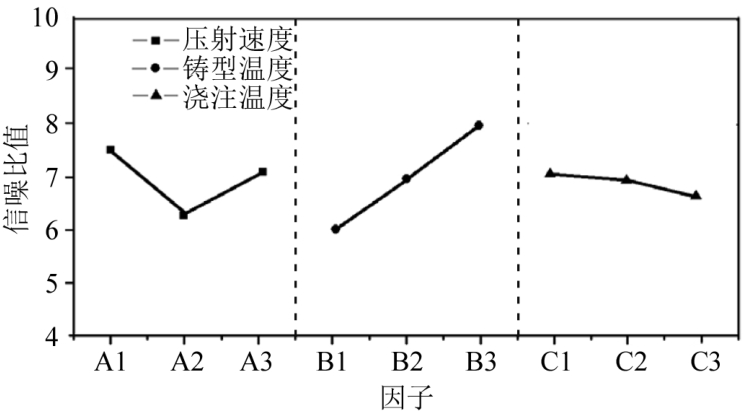 表3 虛擬工藝參數(shù)正交試驗結(jié)果 從表3可以看出,在上述9組試驗中,在沒有干擾因素的影響下,第1組壓鑄工藝參數(shù)的缺陷體積最小,相比質(zhì)量更穩(wěn)定。 信噪比的值對應(yīng)于各因素的水平。通過計算各級各因子的信噪比均值,進一步獲得了信噪比因子水平的極差值。可以預(yù)測出針對試驗?zāi)繕?biāo)響應(yīng)的測試因子的最佳組合,即一套保證了產(chǎn)品質(zhì)量的最穩(wěn)定壓鑄工藝參數(shù)。同時,極差值的大小表示了相應(yīng)因素的影響大小,極差值較大,表明該因素較活躍,其變化對結(jié)果影響也很大;極差值較小,其變化對結(jié)果影響也很小。該算法簡單、直觀,易于使用。在表4列出了信噪比均值和不同級別因素的極值的對比結(jié)果。 從表4可以看出,極差值最大對應(yīng)的是鑄型溫度,最小對應(yīng)的是澆注溫度,因此,試驗因素的順序是鑄型溫度、壓射速度和澆注溫度。表4中各因素的平均信噪比用圖3表示,可以更直觀地解釋工藝參數(shù)對缺陷的影響。從圖3可以看出,當(dāng)壓鑄工藝參數(shù)的組合為A1B3C1時,信噪比最大,即壓鑄件的質(zhì)量穩(wěn)健性最好。此時,壓射速度為0.9 m/s,鑄型溫度為260 ℃,澆注溫度為680 ℃,與上述9組試驗中第9組工藝參數(shù)正好吻合。若上述9組試驗中沒有優(yōu)化得到的工藝參數(shù)組合,需要重新模擬和驗證。
