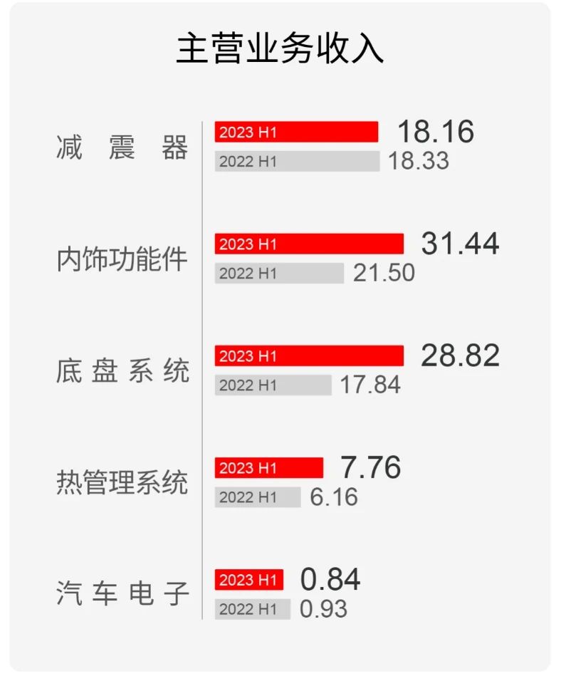 報告顯示,拓普集團主營業務為汽車零部件的研發、生產及銷售,主要產品包括汽車 NVH 減震系統、內外飾系統、輕量化車身、智能座艙部件、熱管理系統、底盤系統、空氣懸架系統、智能駕駛系統共八大業務板塊。上半年公司主營業務國內的營業收入為58.08億元,同比增長33.84%;國外的營業收入為28.95億元,同比增長35.42%。在主營業務中,減震器營收18.16億元,內飾功能件營收31.44億元,底盤系統營收28.82億元,汽車電子營收8380.07萬元,熱管理系統營收7.76億元。