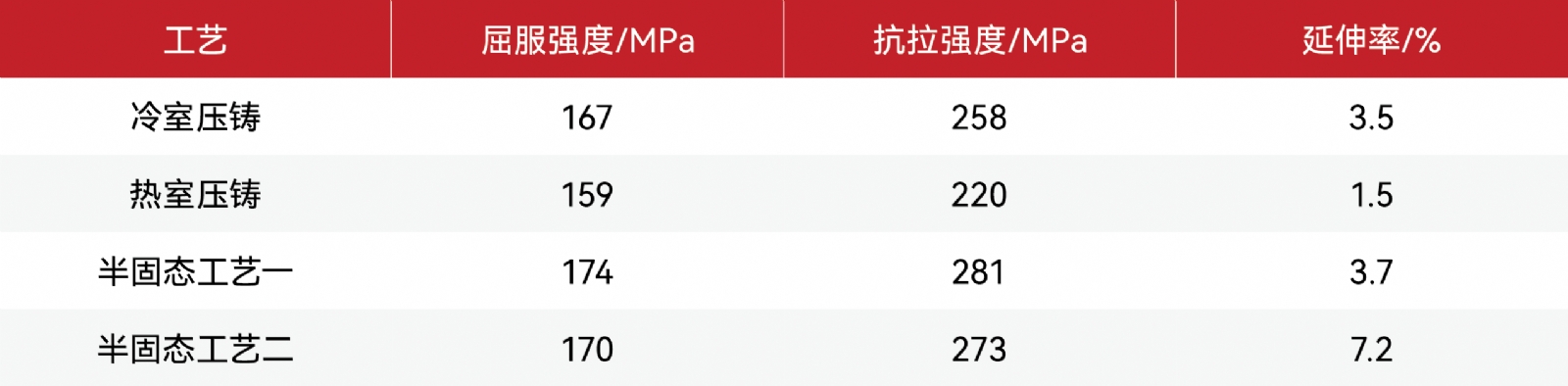 圖:鎂合金半固態(tài)成型過程示意圖 該工藝的核心優(yōu)勢主要體現(xiàn)在以下方面: 良好的流動性與低缺陷成型 高流動性精密成形:利用半固態(tài)漿料的剪切稀化特性,實現(xiàn)復雜薄壁結(jié)構(gòu)(≤1mm)的填充,成形精度更高。 低溫封閉成型:較傳統(tǒng)冷室壓鑄降低100℃左右,大幅抑制縮孔、熱裂、變形等傾向。 充型平穩(wěn):相較于傳統(tǒng)的鎂合金壓鑄,由于漿料流動性的增強,相較于鎂合金高壓壓鑄的高速充速度從6m/s,下降到3-4m/s,半固態(tài)充填過程更加平穩(wěn)。 氧化夾渣傾向小:由于金屬顆粒在相對封閉的空間內(nèi)融化攪拌,和空氣接觸較少,鑄件氧化夾雜物含量較低。 優(yōu)異的表面質(zhì)量與力學性能 表面質(zhì)量躍升:由于半固態(tài)漿料充填能力較強,鑄件表面粗糙度較傳統(tǒng)壓鑄有所提升。表面質(zhì)量的改善部分提升了其鑄態(tài)的抗腐蝕能力,也減少了后續(xù)拋光、噴漆等處理成本。 力學性能突破:剪切力誘導形成均勻細小球晶(50-100μm),加之流動性優(yōu)異、充填質(zhì)量高、組織致密度高、氧化物含量少、氣孔含量少。和傳統(tǒng)高壓壓鑄相比,鑄件鑄態(tài)下抗拉強度提升10%左右,延伸率提高30%-50%。 表:不同成型工藝下的AZ91D鎂合金力學性能