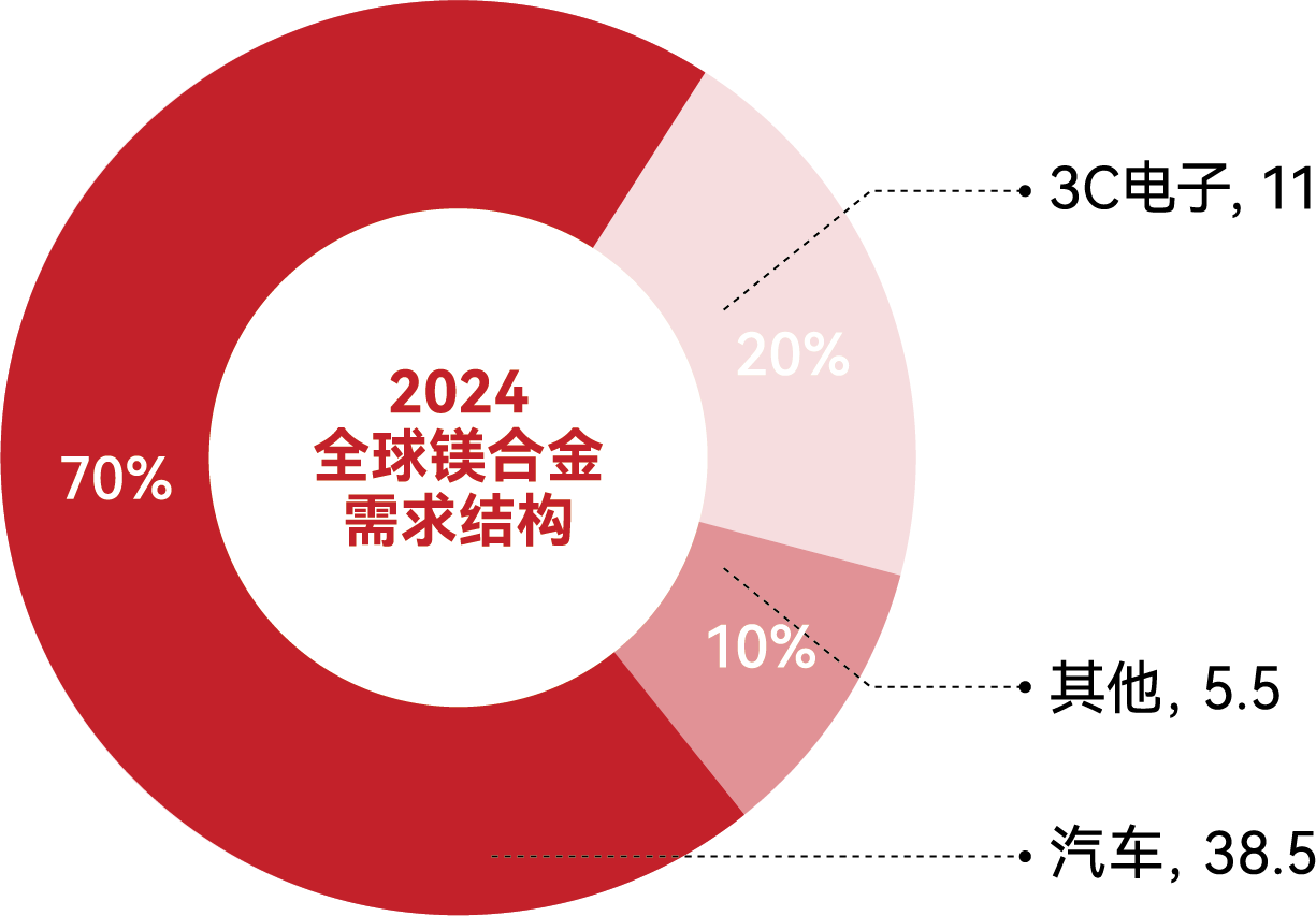 圖:同一變速箱殼體不同工藝的凝固總時長對比 02 顛覆創(chuàng)新,撬動市場機遇 中國是全球最大的新能源汽車生產(chǎn)國。2023年,中國新能源汽車產(chǎn)量達958.7萬輛,占全球60%以上份額,2024年進一步攀升至1316.8萬輛,同比增幅高達38.7%,這一爆發(fā)式增長直接拉動了對輕量化材料的結(jié)構(gòu)性需求。鎂合金憑借高比強度、電磁屏蔽和阻尼減震等復合優(yōu)勢,成為新能源汽車輕量化材料的不二選擇。 據(jù)統(tǒng)計,全球汽車行業(yè)對鎂的需求約為38.5萬噸,占鎂合金總消費市場的70%,覆蓋10大系統(tǒng)、100余種零部件。