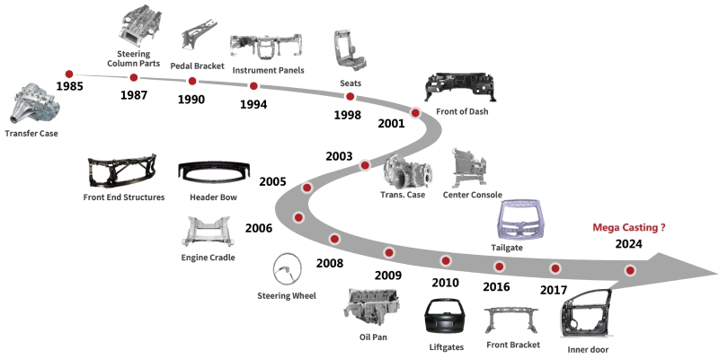 數(shù)據(jù)來源:工信部 從具體應(yīng)用部件看,汽車行業(yè)對鎂合金半固態(tài)成型技術(shù)的需求呈現(xiàn)出從小型件向大型結(jié)構(gòu)件的跨越式發(fā)展。中小型部件:儀表板背板、中控支架等傳統(tǒng)應(yīng)用持續(xù)放量;大型結(jié)構(gòu)件:減震塔、電池包殼體、電機外殼等一體化大件成為新增長點;超大型部件:隨著4000T及以上設(shè)備的普及,車門內(nèi)板、后掀背門內(nèi)板等超大型結(jié)構(gòu)件開始試制。