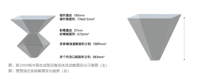注:后兩種半固態(tài)注射成型溫度(即不同固相率條件)不同,延伸率差異較大 高效的材料利用率與生產(chǎn)節(jié)拍 資源高效利用:在無料餅設(shè)計+細流道系統(tǒng)中,材料利用率達70%-85%;由于沒有熔爐融化、直接固態(tài)進料,且成型溫度低100℃,能耗低。 生產(chǎn)效率高:由于沒有厚大的料餅、且澆道細,留模時間大幅縮短,生產(chǎn)周期壓縮20%-30%。