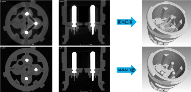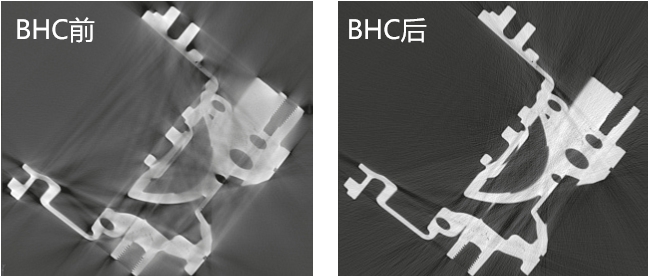 c完善的后處理功能 軟件中可以實現多種后處理操作,對掃描結果進行優化和改善,幫助我們獲得比較完美的掃描數據。比如在下圖中展示的復合材料偽影抑制效果(左)和射束硬化修正的效果(右)。