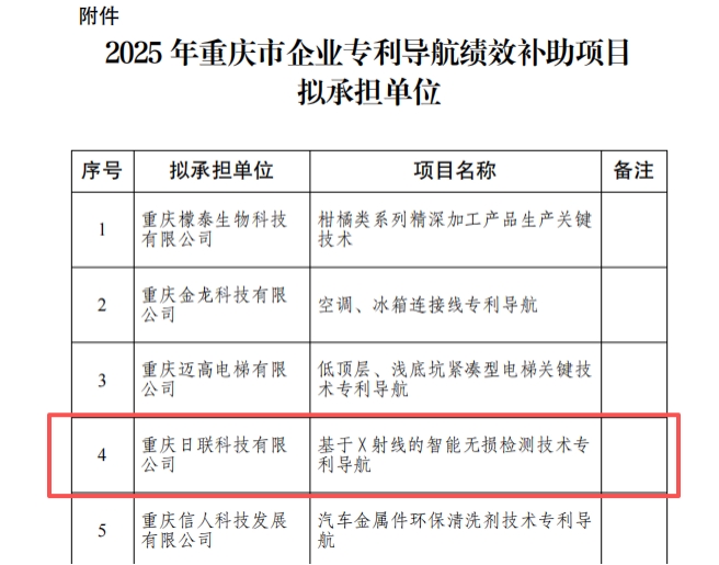 ![]() 近日,重慶市知識產權局公示2025年度企業專利導航績效補助項目擬承擔單位,重慶日聯科技有限公司憑借在工業X射線智能檢測領域的突出成果成功入選。作為國內X射線檢測裝備領軍企業,日聯科技以專利導航為核心戰略工具,在技術突破、產品升級、專利布局與產業賦能等方面實現系統性創新,為重慶智能制造高質量發展樹立標桿。