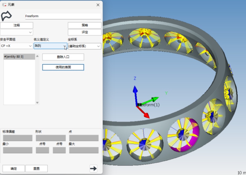 功能3自由曲面陣列(2024版本新增) 功能場(chǎng)景 以前,曲面是無(wú)法陣列的,如果想測(cè)量陣列的曲面特征只能做輔助坐標(biāo)系單獨(dú)創(chuàng)建,或者使用曲線代替曲面,從CALYPSO 2024開(kāi)始,可以應(yīng)用自由曲面元素的陣列設(shè)置。能源行業(yè)的保持架有一個(gè)尺寸是兜孔的輪廓,這類尺寸要么不測(cè),要么用曲線代替,現(xiàn)在可以直接用自由曲面做陣列測(cè)量。 功能價(jià)值 曲面如同其他元素一樣,可以實(shí)現(xiàn)陣列,這大大減少了的曲面的編程工作量。