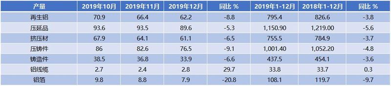 日本鋁業協會發布數據,2019年12月鋁產品產量繼續呈現同比下滑態勢,其中,12月,壓鑄件產量7.65萬噸,同比減少9.1%;再生鋁產量6.2萬噸,同比減少8.8%;延壓品產量8.96萬噸,同比減少5.3%。