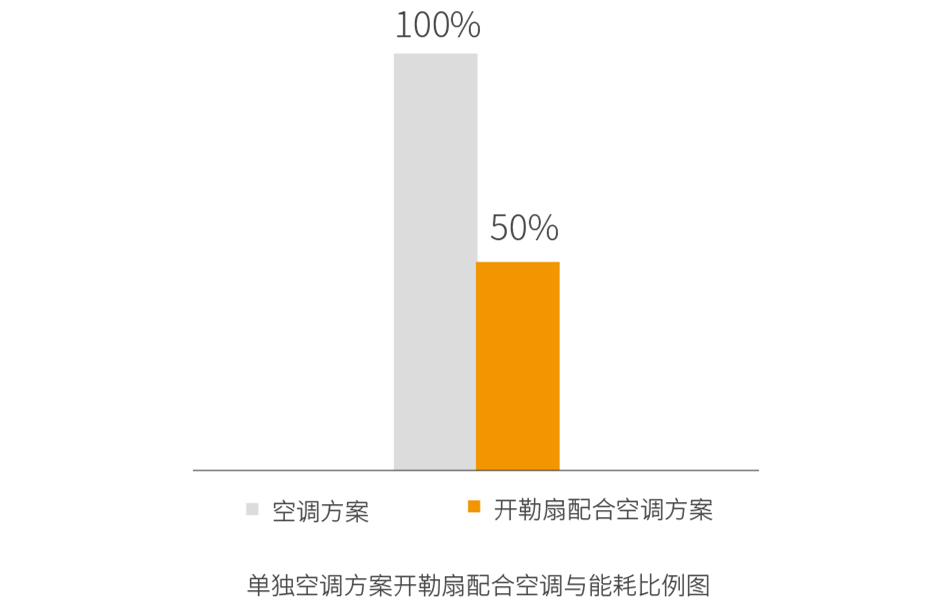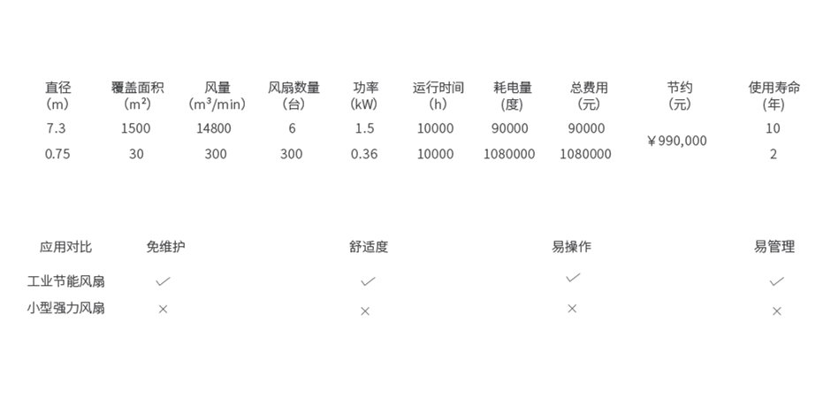 與使用空調(diào)對比 以10000㎡10米高的廠房計算,如果使用空調(diào),每小時電費(fèi)就可高達(dá)500元,一天開工8小時,一個月電費(fèi)就高達(dá)12萬。而用“開勒扇”的話,裝10臺就可解決,以額定功率計算每小時1.5Kw,每月電費(fèi)僅需2000元,是空調(diào)的1.7%。如果一年開3個月風(fēng)扇,就可省下電費(fèi)35.4萬。這樣15年,算下來僅電費(fèi)就可省下531萬!