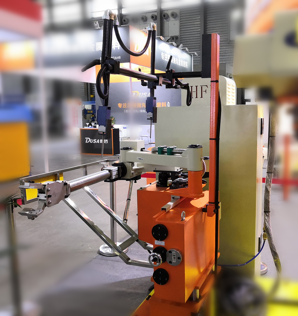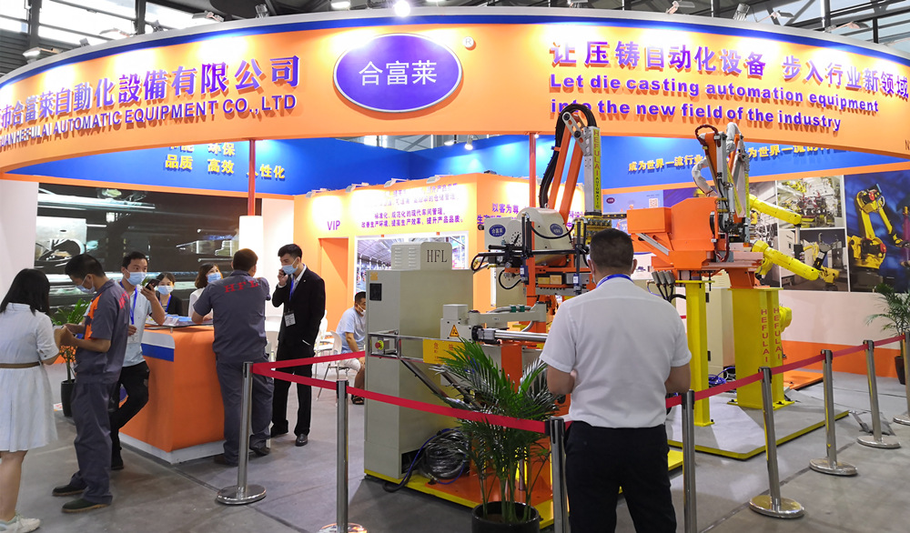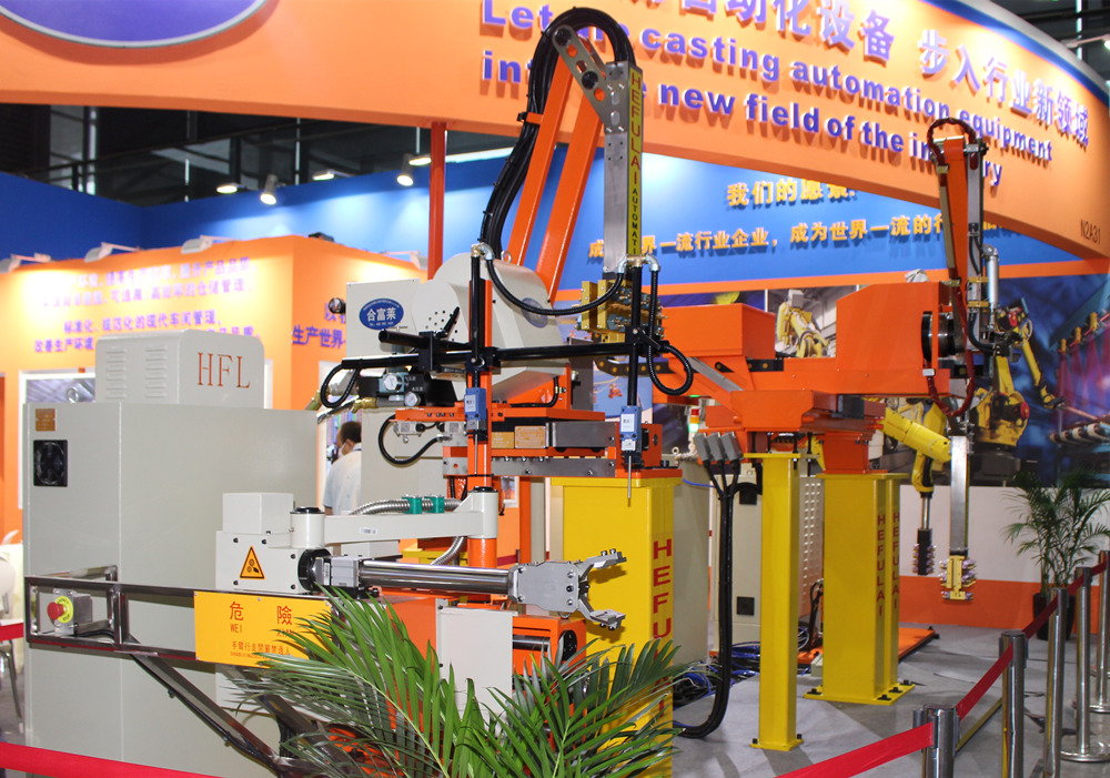 東莞合富萊機器人集成壓鑄島 據介紹,在機器人集成壓鑄島方面,東莞合富萊已完成從自主知識產權的控制系統,到硬件部分,除機器人本體以外的中央控制柜、夾爪、制品檢出、底座、H320沃鈴模組、閥體控制箱、架臺等的開發和制造。同時,聯合用戶的應用場景,開發了許多訂制化的壓鑄島解決方案,掌握了成熟的技術、工藝及應用經驗。公司已為汽車零部件、5G基站配件等壓鑄件生廠商,提供數量眾多的機器人集成壓鑄島生產線。 新型連桿噴取機器人首次亮相華東展會 值得一提的是,東莞合富萊此次展示的HFLREB系列連桿噴取機器人,為首次在國際壓鑄展上展示的產品。這款新產品是在噴取一體線性機器人基礎上進行全面改進的新機型,由于線性機器人導軌長期高溫、腐蝕氣體影響,導致導軌使用壽命短;同時安裝于頭板正上方,取出壓鑄件時,容易受脫模劑霧氣污染,為此該新機型引入傳統壓鑄“三手”的連桿結構的優勢,結合用戶實際生產的實踐并不斷改進優化,既保留了原噴取一體線性機器人的優點,又成功解決了這一缺陷問題。
