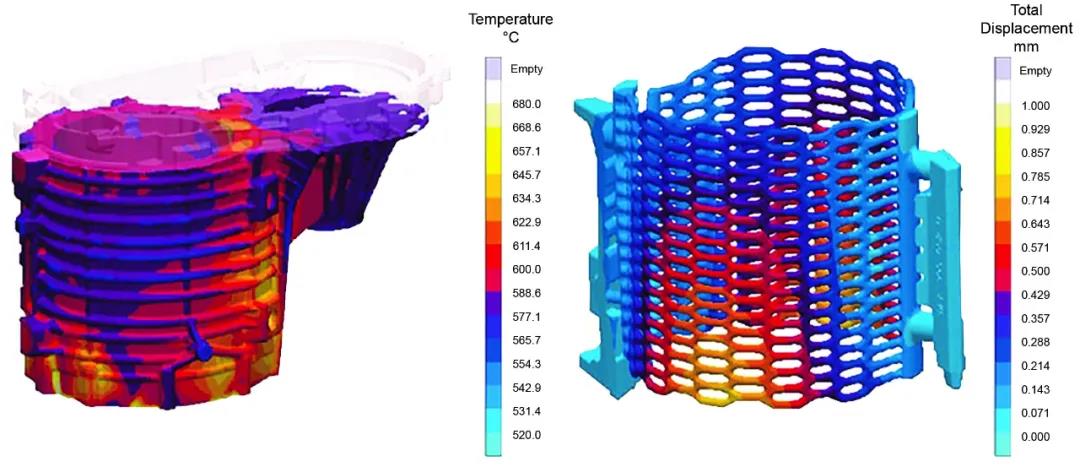 通過CT直接對比不同的鑄造缺陷(藍色為氣體,紅色為縮孔) 砂芯在鑄造過程中的變形 隨著輕量化設計需求的增加,以及由此造成的更薄的壁厚,由變形或砂芯斷裂而導致的與砂芯相關的鑄件缺陷越來越多。MAGMASOFT®5.5可以提供首次預測填充和凝固過程中砂芯的應力,并防止由于砂芯變形或失效而導致的鑄件缺陷,此外,還能夠提供各種砂/粘結劑組合的大量材料數據。除了冷芯,邁格碼還特別關注預測無機砂芯的變形方式。這些獨特的功能避免芯斷裂,能夠預測局部尺寸偏差,并通過改進芯盒設計實現砂芯變形的預補償,為用戶提供了更高的安全性。