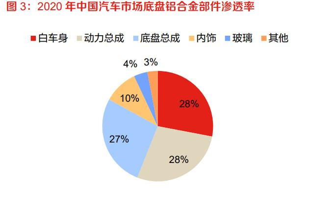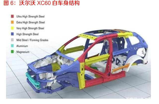 目前底盤輕量化的主要路徑是以鋁合金代替鋼鐵,汽車底盤鋁合金部件包括轉(zhuǎn)向節(jié)、副車架、制 動(dòng)卡鉗、控制臂、輪轂、各種殼體等。據(jù)中國產(chǎn)業(yè)信息網(wǎng)數(shù)據(jù),2020 年中國汽車市場中鋁合金轉(zhuǎn) 向節(jié)、副車架、制動(dòng)卡鉗、控制臂的滲透率分別為 15%、8%、40%、5%,具有廣闊的提升空間。 據(jù)國際鋁業(yè)協(xié)會(huì)數(shù)據(jù),鋁合金在動(dòng)力系統(tǒng)的滲透率達(dá) 90%,汽車底盤與其相比仍是藍(lán)海市場。 國內(nèi)眾多鋁合金精密壓鑄公司均在底盤輕量化領(lǐng)域有所布局,隨著汽車輕量化需求不斷增加,預(yù)計(jì)鋁合金部件將在底盤領(lǐng)域加速滲透,相關(guān)零部件公司有望從底盤輕量化趨勢中持續(xù)受益。 2.2 車身輕量化:熱成型鋼及輕量化工藝為主流途徑 汽車車身是整車重量占比最高的部分,也是輕量化潛力最大的領(lǐng)域,傳統(tǒng)汽車中以高強(qiáng)度鋼代替 普通鋼材能減重約 11%,采用鋁合金則能減重約 40%,輕量化材料減重效果顯著。鑒于車身強(qiáng)度 要求、輕量化材料價(jià)格及加工技術(shù)水平等問題,鋼材作為汽車車身主要材料的地位短時(shí)間內(nèi)難以 撼動(dòng)。 鋁合金材料在輕量化程度和耐腐蝕性等方面相較于鋼材優(yōu)勢明顯,然而鋁合金在車身上的應(yīng)用仍 面臨巨大的挑戰(zhàn):(1)加工工藝復(fù)雜。目前鋼材加工工藝已非常成熟,而鋁合金車身的加工和 連接需要鋁電阻點(diǎn)焊、自沖鉚接、膠接連接、激光焊接等多種工藝,生產(chǎn)流程的復(fù)雜度和自動(dòng)化 要求遠(yuǎn)高于傳統(tǒng)鋼材車身。(2)制造成本高。首先是鋁合金本身的價(jià)格較高,車用鋁合金單價(jià) 約為每噸 1.5 萬,是鋼材料的近 3 倍,其次復(fù)雜的加工工藝使得鋁合金車身成本進(jìn)一步提升。(3)維修成本高,由于鋁材延展性較差且維修工藝復(fù)雜,鋁合金車身維修通常需要全件更換,導(dǎo)致售 后維修費(fèi)用大幅增加。據(jù)文燦股份公告,目前鋁合金車身結(jié)構(gòu)件在燃油車的滲透率僅為 3%,在 純電動(dòng)車的滲透率為 8%,隨著加工工藝改進(jìn)及電動(dòng)汽車減重需求持續(xù)提升,預(yù)計(jì)鋁合金等輕量 化材料在車身上的應(yīng)用將不斷增加。 現(xiàn)階段使用熱成型鋼等超高強(qiáng)度鋼材及輕量化制造工藝是實(shí)現(xiàn)車身輕量化的主流途徑。熱成型鋼 是將鋼板加熱至 880-950℃后,在冷卻模具中進(jìn)行熱沖壓成型及淬火處理,得到超高強(qiáng)度的沖壓 件。熱成型鋼材具有極高的材料強(qiáng)度,具有 1000 MPa 以上的屈服強(qiáng)度和 1300MPa 以上的抗拉 強(qiáng)度,是普通鋼材的 2 倍以上。目前主流的白車身由普鋼、高強(qiáng)度鋼、熱成型鋼等不同強(qiáng)度鋼材 復(fù)合連接而成,其中熱成型鋼通常應(yīng)用于車身前后保險(xiǎn)杠、AB 柱、中通道等重要安全結(jié)構(gòu)件,能 夠以更低的厚度實(shí)現(xiàn)相同的安全性能,從而實(shí)現(xiàn)車身輕量化。除熱成型技術(shù)外,激光拼焊、液壓 成型等輕量化制造工藝也能夠在保證車身安全性的前提下減少鋼板厚度,達(dá)到車身輕量化目的。