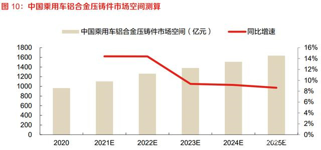 近年來國內(nèi)熱成型等輕量化技術(shù)的發(fā)展迅速,國內(nèi)零部件公司已具備成熟的熱成型技術(shù)能力,能 夠?yàn)閲鴥?nèi)外整車企業(yè)提供 AB 柱、防撞梁、保險(xiǎn)杠等熱成型車身件,有望在車身輕量化的大趨勢 中受益。 2.3 增量領(lǐng)域:新能源汽車三電系統(tǒng)與一體化壓鑄部件 與傳統(tǒng)汽車相比,新能源汽車三電系統(tǒng)將導(dǎo)致整車重量增加,從而影響續(xù)航對于相同車型,三電系統(tǒng)將導(dǎo)致整車額外增加 200-300kg 的重量;同時(shí)新能源車輕量化系 數(shù)比傳統(tǒng)燃油車高 1.5-4 倍,意味著新能源汽車輕量化程度更低。三電系統(tǒng)通常占新能源汽車整 車重量的 30-40%,其輕量化是實(shí)現(xiàn)新能源汽車輕量化、提升續(xù)航的關(guān)鍵。 在新能源汽車三電系統(tǒng)中,電池包是重量最大的部分,約占整車重量的 18-20%,其中電池包殼 體(電池盒)約占電池包重量的 10-20%,是電池包中重量占比僅次于電芯的部件。在電池能量 密度提升逐漸進(jìn)入瓶頸期后,電池盒輕量化成為新能源汽車的重點(diǎn)領(lǐng)域。 電池盒由上蓋和下殼體兩部分組成,目前電池盒上蓋主要材質(zhì)包括沖壓鋼板、沖壓鋁板、SMC 等, 下殼體材質(zhì)以鋁合金為主,按工藝可以分為擠出鋁型材攪拌摩擦成型、沖壓鋁板焊接成型及整體 鑄造成型等。當(dāng)前階段兼顧性價(jià)比和輕量化效果的電池盒最佳輕量化方案是擠出鋁型材下殼體和 SMC 上蓋的組合,隨著碳纖維、鎂合金等材質(zhì)的價(jià)格下降,電池盒輕量化方案有望迎來進(jìn)一步優(yōu) 化。 緊跟新能源汽車快速發(fā)展大潮,文燦股份、凌云股份、華域汽車等國內(nèi)零部件廠商積極開發(fā)輕量 化電池盒產(chǎn)品并取得定點(diǎn)項(xiàng)目。除電池盒外,國內(nèi)廠商在鋁合金電機(jī)、電控系統(tǒng)殼體以及混動(dòng)汽 車變速箱殼體等領(lǐng)域也有相關(guān)布局。隨著新能源汽車產(chǎn)銷量及滲透率持續(xù)上升,三電系統(tǒng)輕量化 有望打開國內(nèi)零部件廠商新增量空間。 在特斯拉的引領(lǐng)下,國內(nèi)多家鋁合金壓鑄零部件公司開始布局一體化壓鑄技術(shù),購入多臺巨型壓 鑄機(jī)用于車身結(jié)構(gòu)件等領(lǐng)域的一體化壓鑄。一體化壓鑄具有流程簡便、生產(chǎn)效率高、輕量化程度 高等優(yōu)點(diǎn),隨著一體化壓鑄規(guī)模擴(kuò)大,生產(chǎn)成本也將逐漸降低,預(yù)計(jì)未來將有更多整車企業(yè)采用 一體化壓鑄技術(shù),一體化壓鑄滲透率有望持續(xù)提升。(報(bào)告來源:未來智庫) 3 行業(yè)市場空間及特性 3.1 行業(yè)市場空間較大 我們根據(jù)中國乘用車產(chǎn)量、乘用車單車用鋁量、鋁合金壓鑄件占汽車用鋁量比例以及車用鋁合金 零部件銷售價(jià)格,測算 2020-2025 中國車用鋁合金壓鑄件市場空間: (1)中國乘用車產(chǎn)量:2020、2021 年中國乘用車產(chǎn)量分別為 1999.41 萬輛及 2140.80 萬輛,據(jù) 中汽協(xié)預(yù)測,2022 年中國乘用車產(chǎn)量將達(dá)到 2300 萬輛,同比增長約 7.4%。2023-2025 年預(yù)計(jì)中 國乘用車產(chǎn)量增速將有所放緩,增速降至每年約 3%。 (2)中國乘用車單車用鋁量:2020 年中國乘用車單車用鋁量為 138.6 千克,預(yù)計(jì) 2025 年將提升至 187.1 千克,2020-2025 年復(fù)合增 速為 6.2%。 (3)鋁合金壓鑄件占汽車用鋁量比例:壓鑄件是汽車上應(yīng)用最為廣泛的鋁合金形態(tài),廣泛應(yīng)用 于底盤、車身、動(dòng)力系統(tǒng)等領(lǐng)域。據(jù)壓鑄雜志,壓鑄鋁合金約占汽車用鋁量的 77%。 (4)車用鋁合金壓鑄件銷售價(jià)格:據(jù)愛柯迪招股說明書數(shù)據(jù)測算,汽車鋁合金壓鑄件行業(yè)平均 售價(jià)約為4.52萬元/噸。由于鋁合金壓鑄件價(jià)格受鋁價(jià)波動(dòng)影響較大,我們假設(shè)汽車鋁合金壓鑄件 平均售價(jià)始終維持不變。 根據(jù)以上數(shù)據(jù)測算,預(yù)計(jì) 2025 年中國乘用車鋁合金壓鑄件市場空間將達(dá)到 1637.14 億元,2020- 2025 年市場空間復(fù)合增速約為 11.2%,車用鋁合金壓鑄件市場前景廣闊。