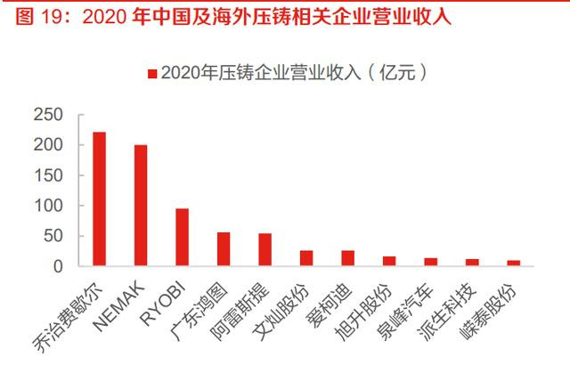 5 競爭格局:布局輕量化及一體化壓鑄自主供應(yīng)商規(guī)模有望快速提升 我國輕量化壓鑄行業(yè)集中低,參與企業(yè)眾多,整體競爭較為激烈。根據(jù)文燦股份招股說明書, 2018 年我國壓鑄行業(yè)相關(guān)企業(yè)數(shù)量約 12600 家,其中生產(chǎn)壓鑄件的企業(yè)數(shù)量占比 70%以上,存 在各類不同生產(chǎn)規(guī)模的壓鑄件生產(chǎn)商,大部分供應(yīng)商的輕量化壓鑄件產(chǎn)能較低。 外資或合資品牌的壓鑄件供應(yīng)商數(shù)量較少,單個(gè)企業(yè)的規(guī)模大,專業(yè)化程度高,在資金、技術(shù)、 生產(chǎn)規(guī)模等方面具備優(yōu)勢,領(lǐng)先于國內(nèi)大多數(shù)供應(yīng)商,通過在國內(nèi)設(shè)立合資公司或子公司切入中 國市場,相關(guān)企業(yè)包括 NEMAK、RYOBI、阿雷斯提、皮爾博格、喬治費(fèi)歇爾、DGS 等。 國內(nèi)自主品牌的輕量化壓鑄供應(yīng)商可分為兩類,一類從屬于下游的整車集團(tuán),依附于整車廠為相 關(guān)車企提供壓鑄件產(chǎn)品配套,包括長城汽車成立的壓鑄事業(yè)部、比亞迪旗下的弗迪精工等;另一 類是獨(dú)立的輕量化壓鑄件供應(yīng)商,2018年國內(nèi)壓鑄企業(yè)中大型壓鑄企業(yè)占比僅10%左右,少數(shù)國 內(nèi)獨(dú)立供應(yīng)商具備高質(zhì)量的輕量化壓鑄產(chǎn)品及大型復(fù)雜模具的自制能力,能夠?qū)蛻粜枨筮M(jìn)行快 速反應(yīng)和持續(xù)改善,已經(jīng)與國內(nèi)外知名車企建立了長期穩(wěn)定的合作關(guān)系,具備一定實(shí)力,相關(guān)自 主供應(yīng)商包括文燦股份、泉峰汽車、愛柯迪、拓普集團(tuán)、旭升股份等。 從產(chǎn)品范圍看,大部分外資及合資品牌、自主品牌均在車身、傳動(dòng)、底盤、轉(zhuǎn)向等多個(gè)系統(tǒng)領(lǐng)域 布局,涉及的輕量化壓鑄件產(chǎn)品包括變速器殼體、電機(jī)殼體、支架、缸體、缸蓋等。 從各壓鑄企業(yè)相關(guān)客戶看,外資及合資品牌中 RYOBI、阿雷斯提等日系供應(yīng)商更多與日系車企進(jìn) 行合作,例如阿雷斯提與豐田、日產(chǎn)、本田、鈴木等合作配套;而皮爾博格、DGS、喬治費(fèi)歇爾 等歐美供應(yīng)商更多為奧迪、寶馬、奔馳、大眾、通用等歐美車企配套壓鑄產(chǎn)品;國內(nèi)自主供應(yīng)商 配套客戶眾多,客戶范圍涉及美系、日系、歐系、自主車企等,例如嶸泰股份的客戶包括大眾、 奧迪、寶馬等外資品牌,也包括長城、吉利、比亞迪等自主品牌;旭升股份為特斯拉、理想、蔚 來、零跑等眾多新勢力配套壓鑄件。 從全球壓鑄件企業(yè)營業(yè)收入看,外資壓鑄企業(yè)的收入規(guī)模相對較高,國內(nèi)大部分壓鑄企業(yè)與國外 企業(yè)規(guī)模上存在差距。具體來看,營業(yè)收入較高的幾家頭部壓鑄企業(yè)分別是喬治費(fèi)歇爾、 NEMAK、RYOBI 等,2019 年喬治費(fèi)歇爾、NEMAK 營業(yè)收入超過 250 億元,2020 年受疫情影響 收入有所下滑,但仍超過 200億元,綜合競爭力強(qiáng);國內(nèi)大部分壓鑄企業(yè)的收入規(guī)模均在 30 億元 以下,與外資企業(yè)差距明顯,國內(nèi)營業(yè)收入較高的企業(yè)包括廣東鴻圖、文燦股份、愛柯迪等,國 內(nèi)各壓鑄企業(yè)擴(kuò)產(chǎn),通過性價(jià)比優(yōu)勢獲取更多新訂單,布局一體化壓鑄等新技術(shù),逐步縮小與外 資壓鑄企業(yè)的差距。