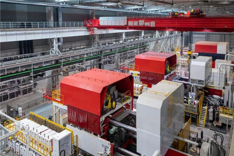 還有,大型鋁合金零部件讓回收再利用變得更加簡單高效。鋁合金代替鋼材用于車身的一個缺點是碳排放,從礦山到金屬原料,鋁的碳排放大約是鋼材的4倍左右。鋁合金大鑄件會讓回收利用變得簡單高效,從而提升回收利用率,在全生命周期降低碳排放。 特斯拉的大型壓鑄機最早在加州工廠落地投產,目前加州工廠2臺,上海工廠4臺,得州工廠4臺,柏林工廠2臺、計劃再增加6臺。該壓鑄機供應商是意大利的意德拉公司(IDRA),意德拉在2008年被香港力勁集團收購。 Model Y后車架的壓鑄機鎖模力為6000噸,三維尺寸為20米、7.5米、6米,重量410噸。 2023年將在得州工廠量產的皮卡車型Cybertruck壓鑄機為8000噸。未來,特斯拉還計劃將前車架&座艙、地板&電池殼也采用一體化壓鑄工藝,如果全部實現,可以代替原本370多個零部件的沖壓焊接,使整車減重10%,續航提升 14%。