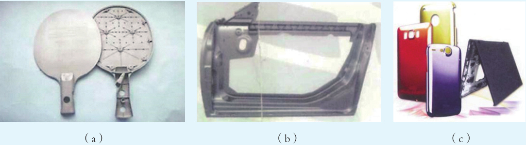 這批企業的 主要特點如下: 四、內地港資企業的騰飛 得益于國家改革開放的政策扶持和香港地區人民奮斗不息、進取不止的精神傳承,進入21世紀,許多內地港資和中港合資壓鑄企業已轉型升級為集產品設計、科研開發、模具開發、原設備生產、原設計生產、原品牌生產、市場營銷于一體的大型現代企業,在科研、產品、市場等方面碩果累累。 (一)首創的輕量化壓鑄產品豐富多彩 新一代稀土壓鑄材料的開發,使壓鑄出 0.3mm超薄壁鑄件成為可能,這種鑄件可廣泛應用在當今新一代 4C產品上,從而影響、推動 4C產品的設計。順景園精密鑄造(深圳)有限公司研發突破鋁合金最薄壁厚極限 0.5mm的鋁合金乒乓球拍壓鑄件,宜安(香港)有限公司國內首創鎂合金轎車門壓鑄件;嘉瑞集團有限公司研發出 0.45mm的鎂合金壓鑄筆記本外殼和 0.38mm的鋅合金壓鑄手機外殼,見圖3(a)(b)(c)
