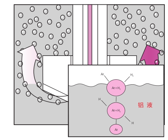 Calgas ® 的轉(zhuǎn)子能有效將惰性氣體打散成細(xì)小氣泡,均勻地在鋁液中散開、浮升。鋁液中的氫分壓比氣泡中高,氫會(huì)向惰性氣體擴(kuò)散,并隨氣泡上浮至液面,從而有效地降低鋁液中的氫含量。
