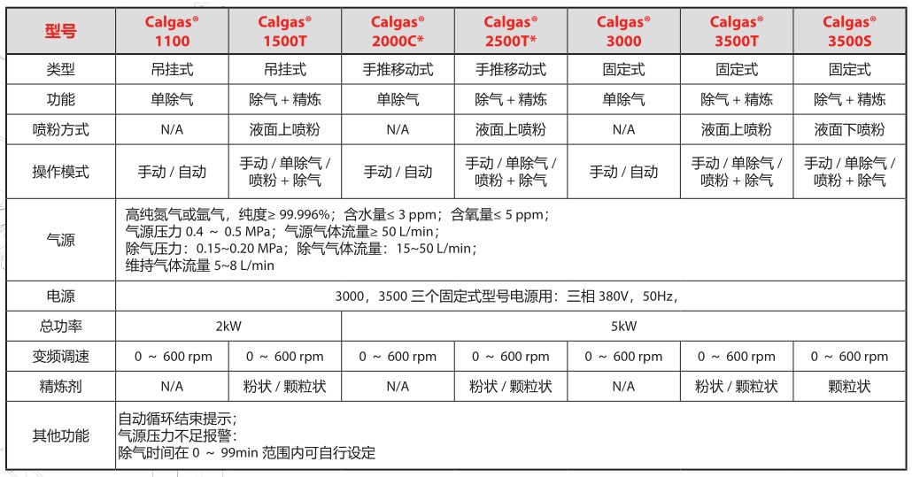 Calgas ® 除氣機(jī)有單除氣功能的 1100、2000C、3000 型,除氣精煉結(jié)合為一體的1500T、2500T、3500T和3500S型可選,并可針對(duì)客戶的需求特別設(shè)計(jì)。