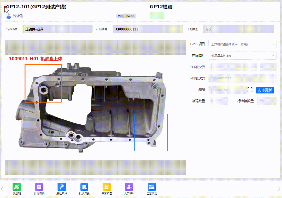 GP12產線終端界面(適用單件產品) 當檢測合格數量達到產品標準箱數量時,會自動觸發箱碼打印,同時支持二次檢驗、不滿箱打印,產品換箱等多種使用場景,基本覆蓋了客戶對GP12系統流程的所有要求。【適用范圍:單件管理的產品】