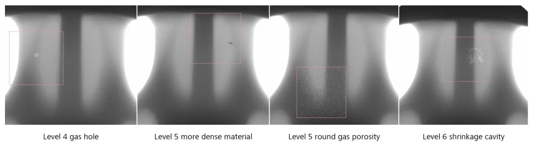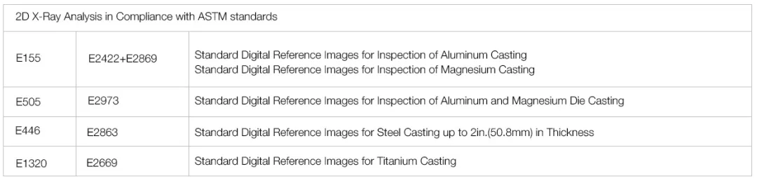 截止今日X-Ray已廣泛的用于鑄件的無損檢測領(lǐng)域,并且根據(jù)不同的應(yīng)用場景及客戶需求演化成了兩派,分別是2D和3D。其中2D檢測由于其成像速度快,能夠做到100%在線全檢,從而得到了各大主機廠及其供應(yīng)商的廣泛應(yīng)用,也催生了相應(yīng)的行業(yè)和企業(yè)標準。其中最被廣泛接受和使用的為ASTM制定的行業(yè)標準和主機廠設(shè)立的企業(yè)標準。