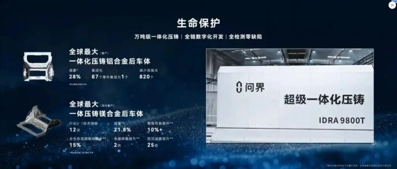 作為賽力斯技術實力的核心載體,問界品牌已構建起差異化的制造技術壁壘。在車身工藝領域,問界汽車超級工廠,配置了7000噸、9000噸、9800噸等型號的超大型壓鑄島,生產前機艙、后車體、CD柱等一體化壓鑄件。其中,一體化壓鑄后車體將傳統工藝中分散的87個零件集成為單一結構零部件,減少820個連接點的同時實現28%的減重效果 。這一技術已在問界M9、M8等車型量產落地。