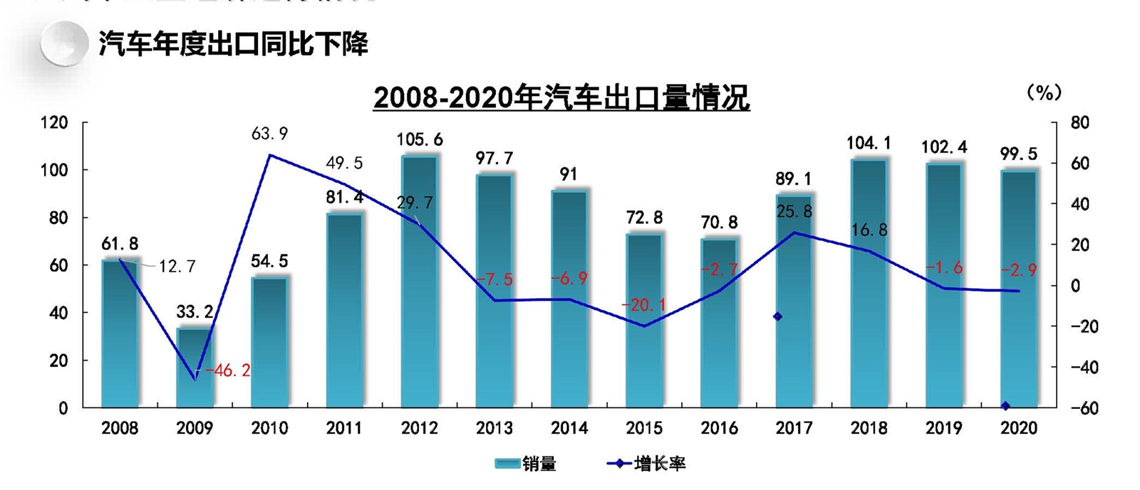 新能源汽車從7月開始呈現增長態勢,增幅逐漸擴大,且每個月產銷均刷新當月歷史記錄,12月更創下歷史新高。 汽車年度出口同比下降 2020年12月,汽車出口14.5萬輛,環比增長18.3%,繼11月汽車出口創歷史新高后,本月出口再創歷史新高。受海外疫情影響,汽車出口呈現下降。2020年全年汽車出口99.5萬輛,同比下降2.9%。