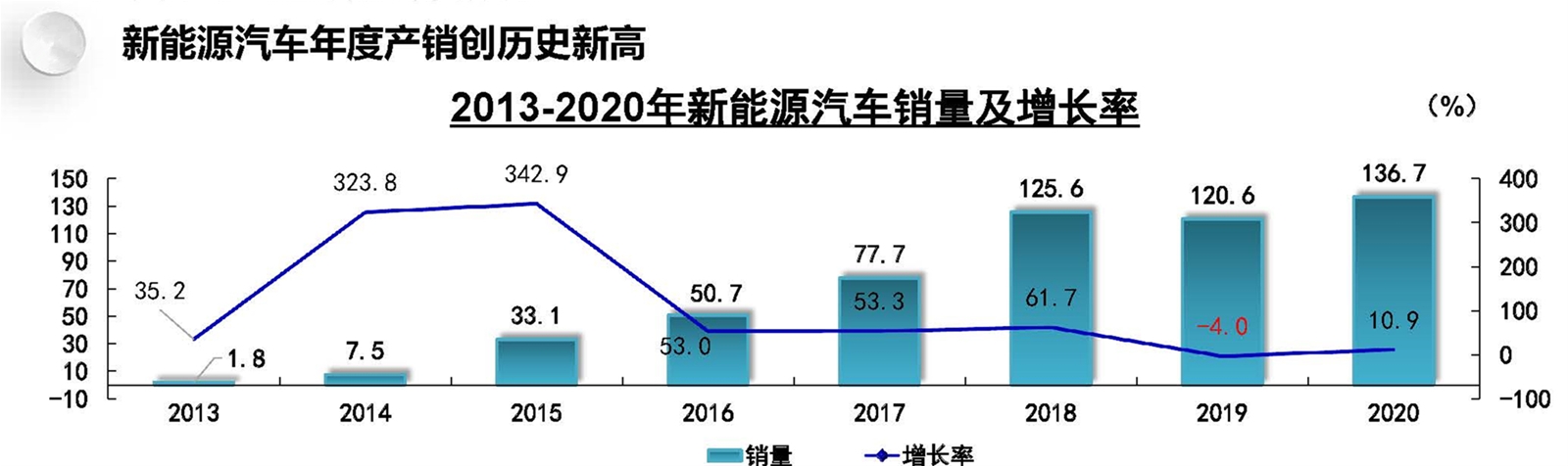 新能源汽車年度產銷創歷史新高 2020年12月,新能源汽車產銷分別完成23.5萬輛和24.8萬輛,同比增長55.7%和49.5%。2020年全年產銷分別完成136.6萬輛和136.7萬輛,同比分別增長7.5%和10.9%,增速較上年實現了由負轉正。
