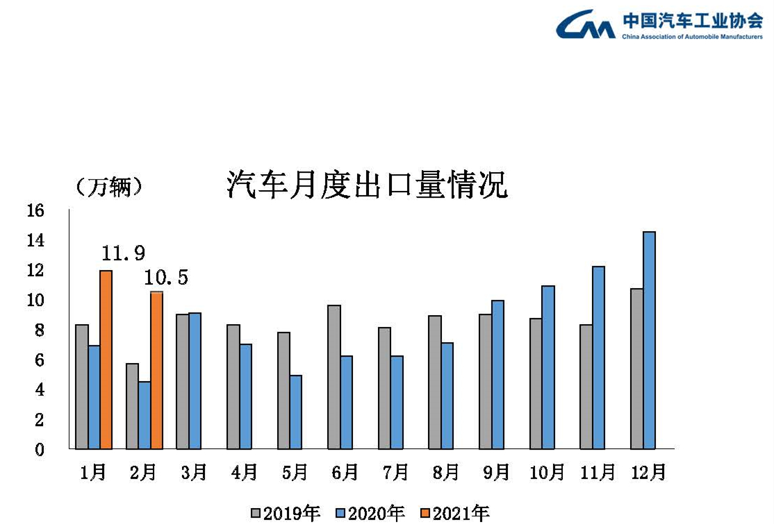 汽車(chē)出口繼續(xù)刷新當(dāng)月歷史記錄 2月,汽車(chē)企業(yè)出口10.5萬(wàn)輛,環(huán)比下降12.5%,同比增長(zhǎng)1.3倍。本月出口數(shù)據(jù)繼續(xù)刷新當(dāng)月歷史記錄。1-2月,汽車(chē)企業(yè)出口22.4萬(wàn)輛,同比增長(zhǎng)97.8%。